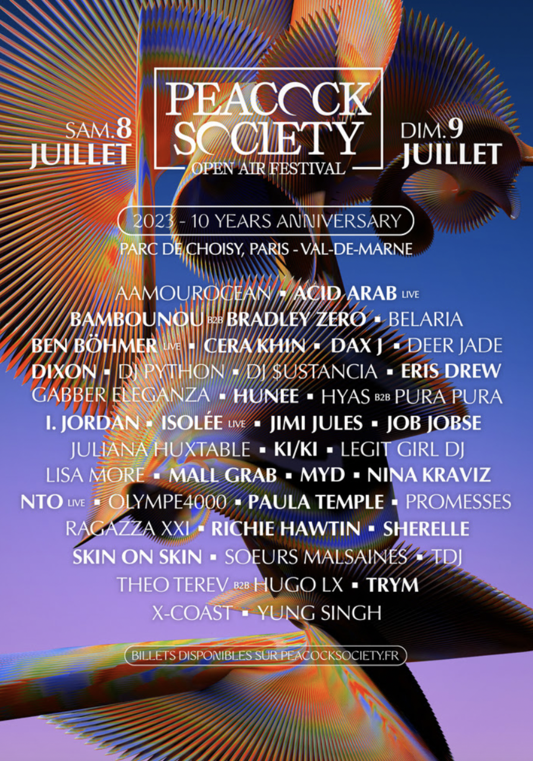 En 2023, quoi de neuf ? On retrouvera à Choisiy en juillet une programmation diverse et intergénérationnelle, brassant ainsi plusieurs générations de musiciens. Paul Bonabesse, programmateur de Peacock : « Il fallait marquer le coup en invitant quelques piliers qui ont fondé les sonorités de Peacock Society. On retrouve Richie Hawtin qui voulait revenir sur le festival pour les 10 ans. On a aussi Nina Kraviz, Dixon et notamment Bambounou qui ont été là au fil des années sur le festival. On voulait aussi créer quelque temps fort avec des back-to-back inédits qu’on invite avec Bradley Zero« .