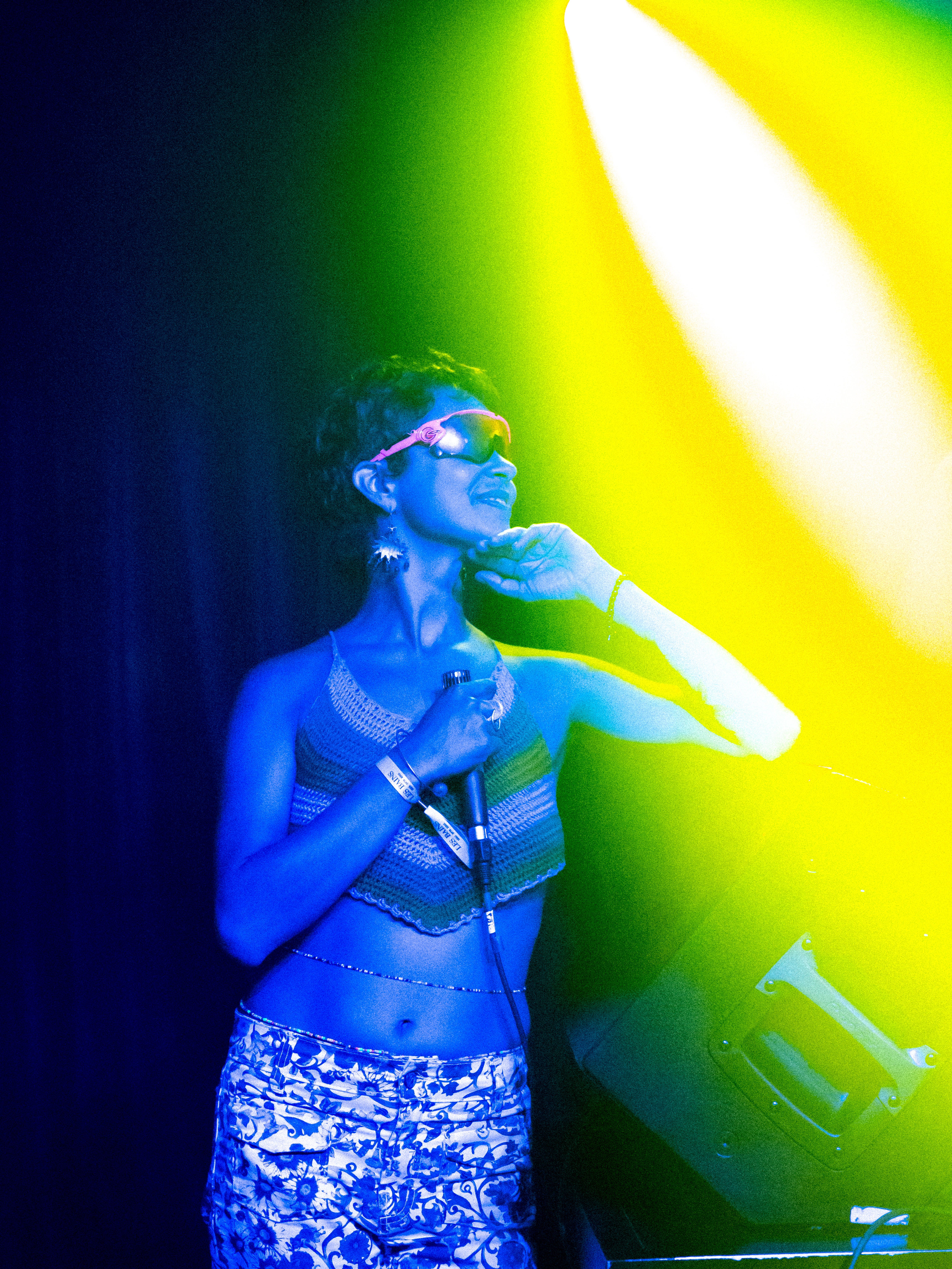 Un peu plus tard dans la soirée, on descend les marches, guidé·es par l’équipe de l’hôtel reconvertie en staff de festival pour l’occasion, et une odeur bien particulière, mélange de chlore, de machine à fumée et de parfum, flotte dans l’air. Au fond de la pièce qui abrite le (fameux) bassin est installée la scène “Club”. Et sur cette scène, NINA, une jeune chanteuse qui confectionne une pop française, “un peu cold” selon ses dires. Pour elle aussi, le lieu a toute son importance : “C’est incroyable pour moi de jouer aux Bains. Mon père était barman ici dans sa jeunesse. Et ça fait hyper plaisir de partager la scène avec d’autres artistes qui essayent de faire leur place comme moi, c’est trop rare ce genre de moments”. Les lumières l’éclairent, les lignes de basse résonnent, son timbre de voix puissant remplit la pièce dès la première note.  “On t’aime Nina !”