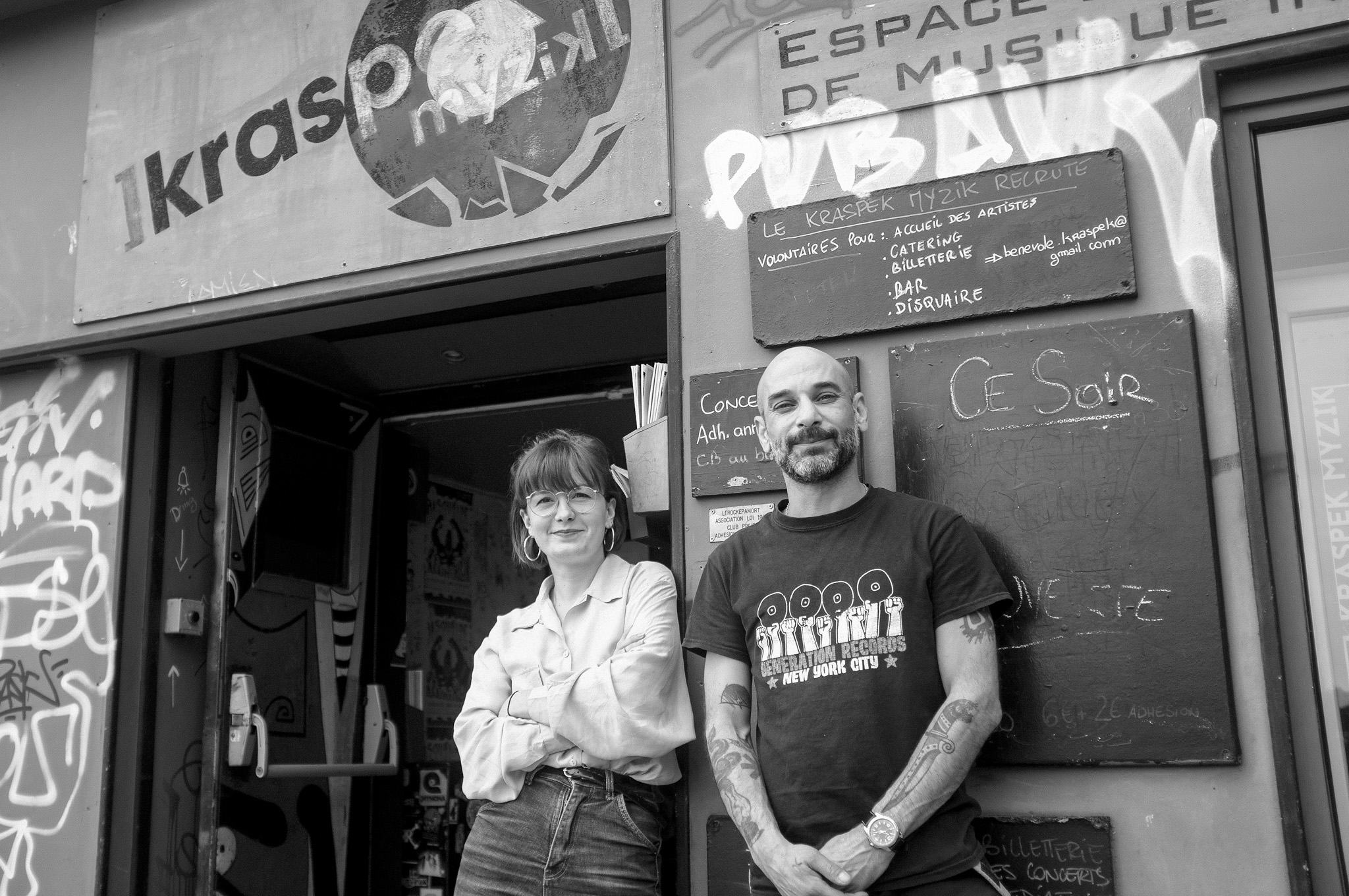 En 2005, l’association Lerocképamort s’implantait au 20 de la Montée Saint-Sébastien, sur les cendres du haut-lieu underground Kafé Myzik, pour ouvrir son successeur : le Kraspek Myzik. Près de vingt ans plus tard, ce café culturel progressivement devenu salle de concert à part entière est encore debout, notamment grâce à l’enthousiasme de celui et celle qu’Antoine a rencontrés : Franck Guscioni, directeur/programmateur et Inès Bourgeois, chargée de communication. Avec eux, on se rend vite compte que la taille modeste (80 places maximum) de ce lieu dédié aux projets musicaux émergents n’est certainement pas une entrave à sa vitalité. Entre mise en avant de la scène locale, volonté de mélanger les publics, culture à l’ancienne de l’affichage sauvage et héritage de l’esprit bordélique des pentes, le Kraspek s’assume clairement comme un indispensable de l’écosystème musical de la ville. Tiny but mighty !