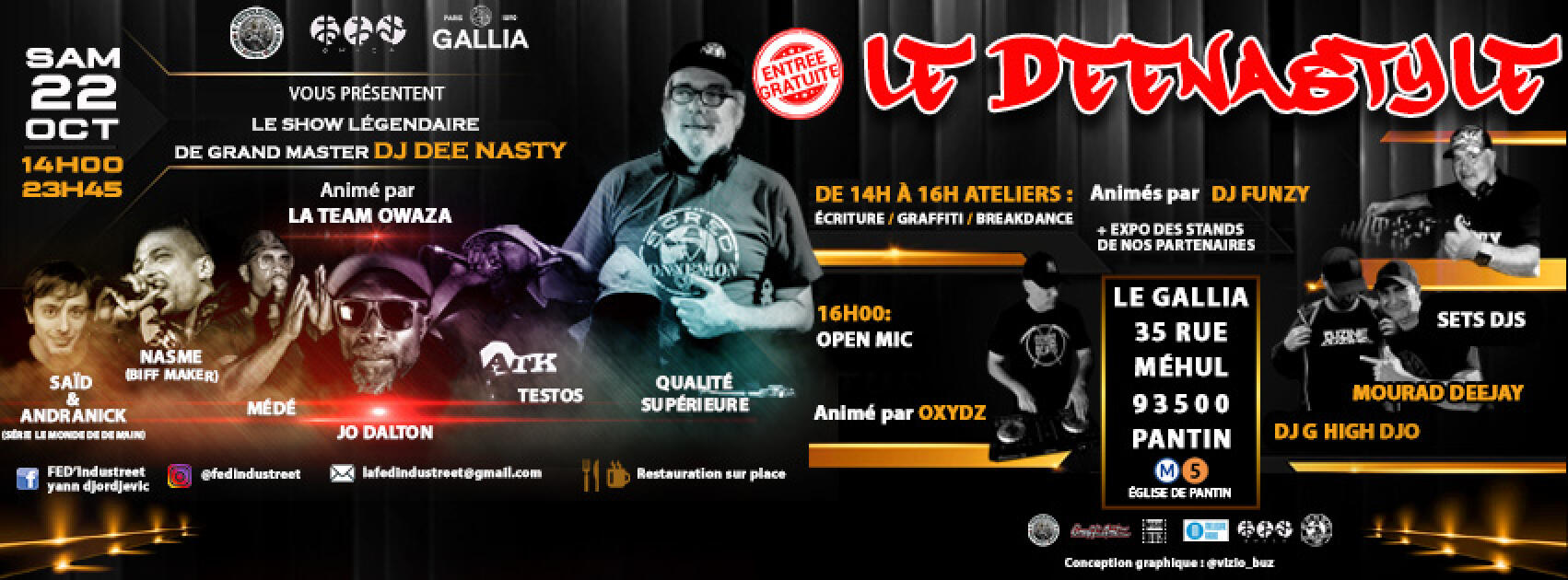 Alors, nous vous partageons l’appel de Dee Nasty, parvenu à nos oreilles : « DJ DEE NASTY, la fed industreet & Owaza sont heureux de vous accueillir s𝗮𝗺𝗲𝗱𝗶𝟮𝟮 o𝗰𝘁𝗼𝗯𝗿𝗲 au Gallia (Pantin) pour la nouvelle édition du 𝗗𝗘𝗘𝗡𝗔𝗦𝗧𝗬𝗟𝗘, évènement légendaire pour tous les amoureux du hip-hop ! ».