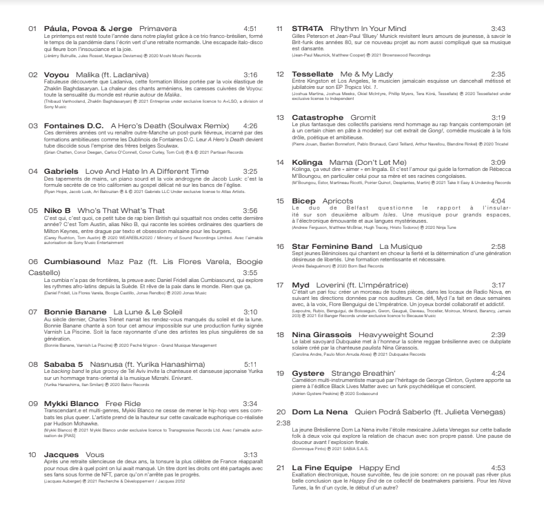 La naissance d’un trio nommé Paula Povoa & Jerge (aka PPJ), un remix atomique suintant la bière de Fontaines D.C. par Soulwax, la solaire et unique Bonnie Banane, un anthem pour une vie plus libre par Mykki Blanco, le retour de Jacques version NFT, Bicep qui aura réussi à nous faire patienter quant à la ré-ouverture des clubs, un titre de lover fait maison par Myd & L’Impératrice, et bien d’autres, le tout se terminant toujours par un Happy End, car une seule chose nourrit Radio Nova : la passion.