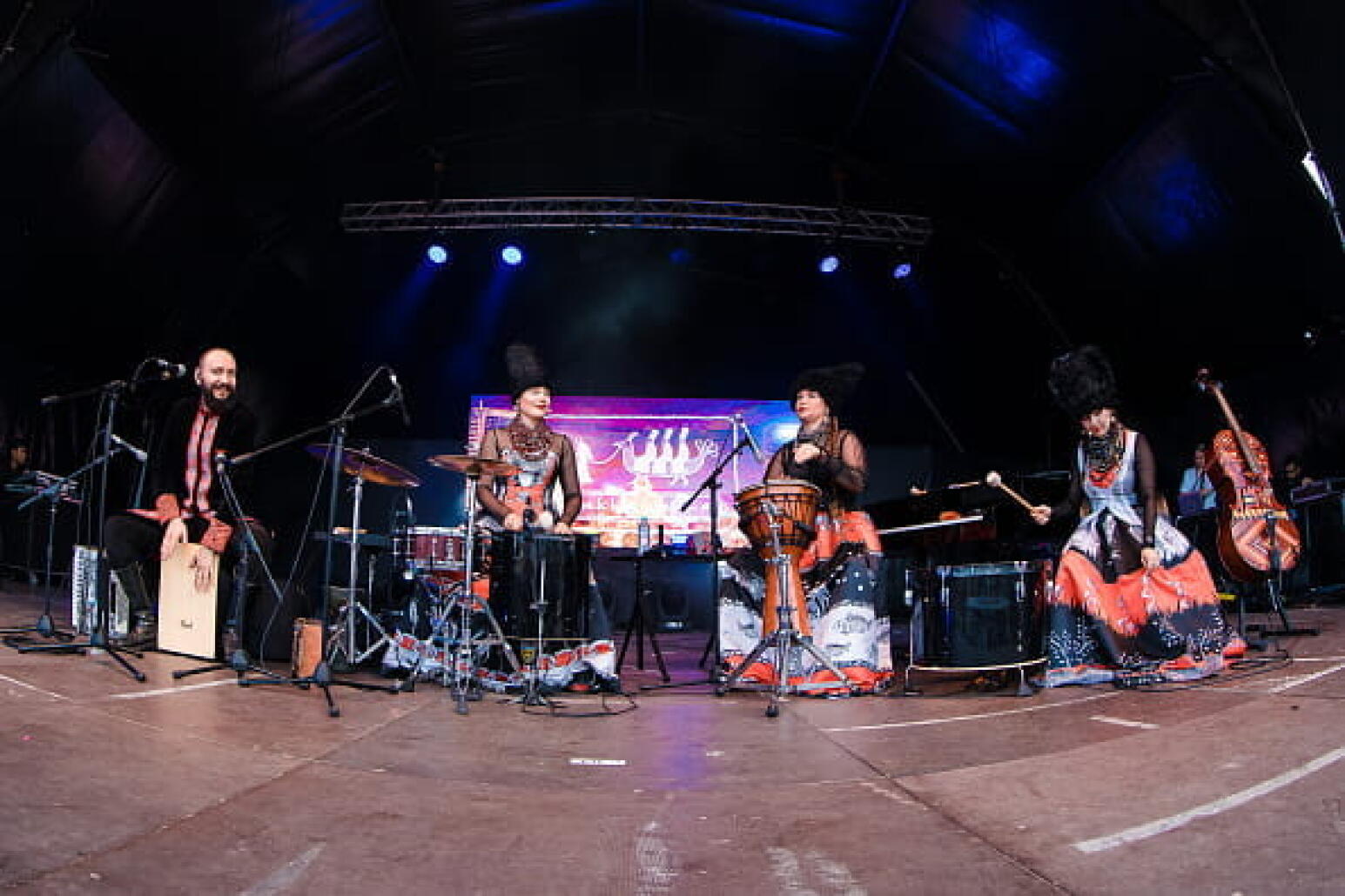 Les Dakhabrakha c’est un quatuor composé de trois musiciennes et d’un musicien. On les reconnaît aisément à leurs tenues inspirées des coiffes et des robes traditionnelles d’Europe de l’Est.