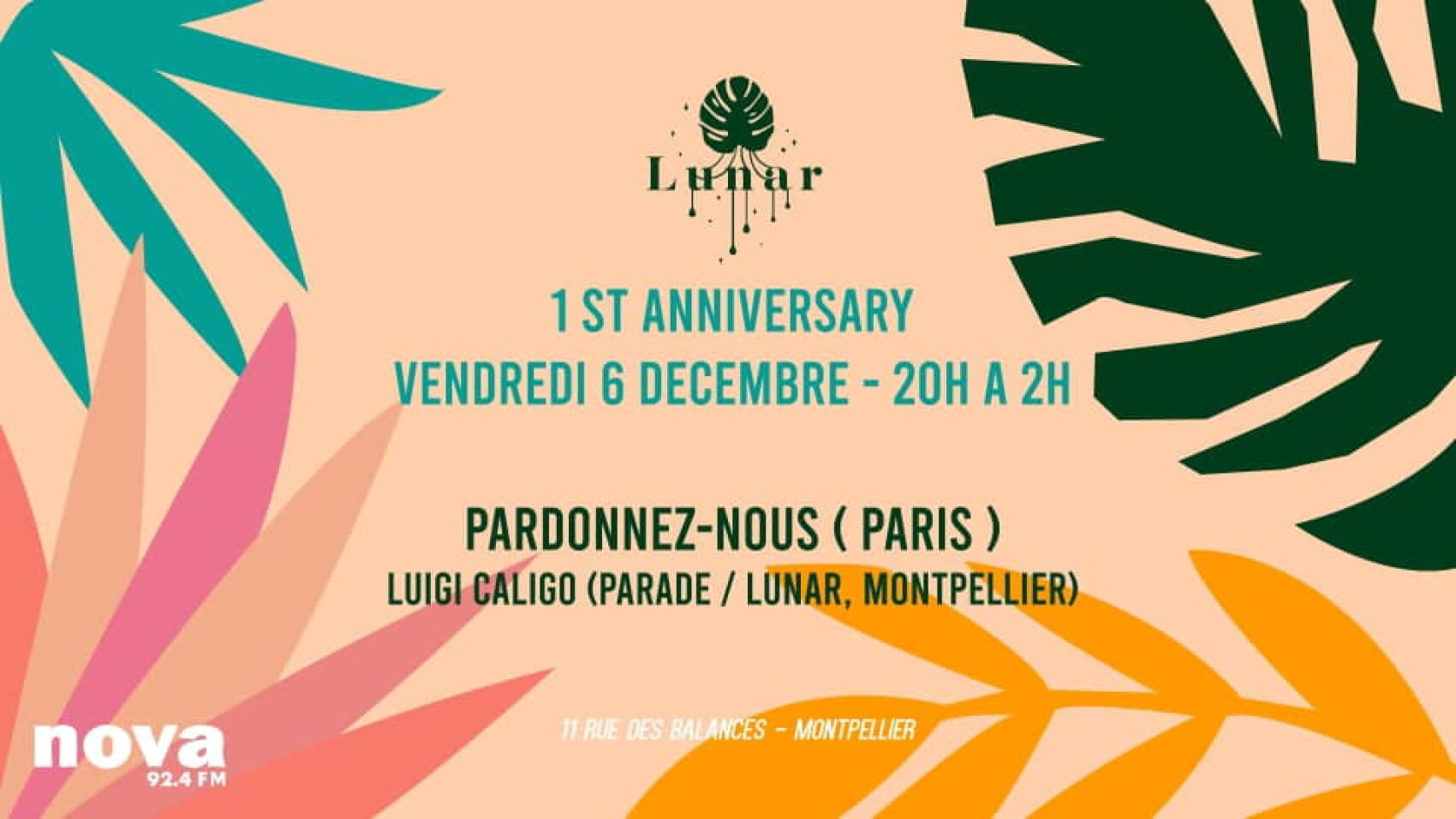 1st Anniversary Lunar w/ Pardonnez-nous | Vendredi 6 décembre de 20h00 à 02h00 au Lunar, 11 rue des balances, 34000 Montpellier | Évent facebook ici-même