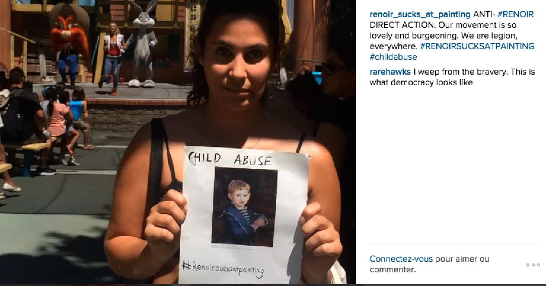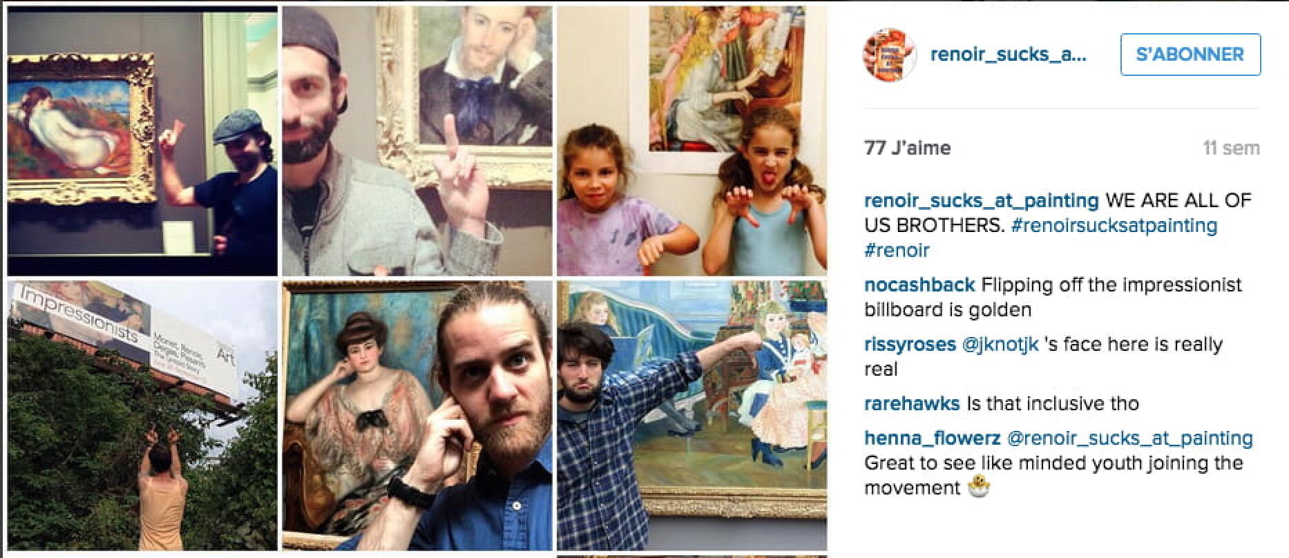 Dieu hait Renoir ! Renoir n’est qu’un étron fumant ! Renoir, ça gonfle ! C’est le genre de slogans choc que brandissait ce lundi 5 octobre 2015, une douzaine de manifestants devant le Musée des beaux-arts de Boston, réunis autour de Max Geller, créateur du compte Instagram « Renoir Sucks At Painting » qui milite pour le décrochage pur et simple des œuvres de Pierre Auguste Renoir dans tous les musées américains…