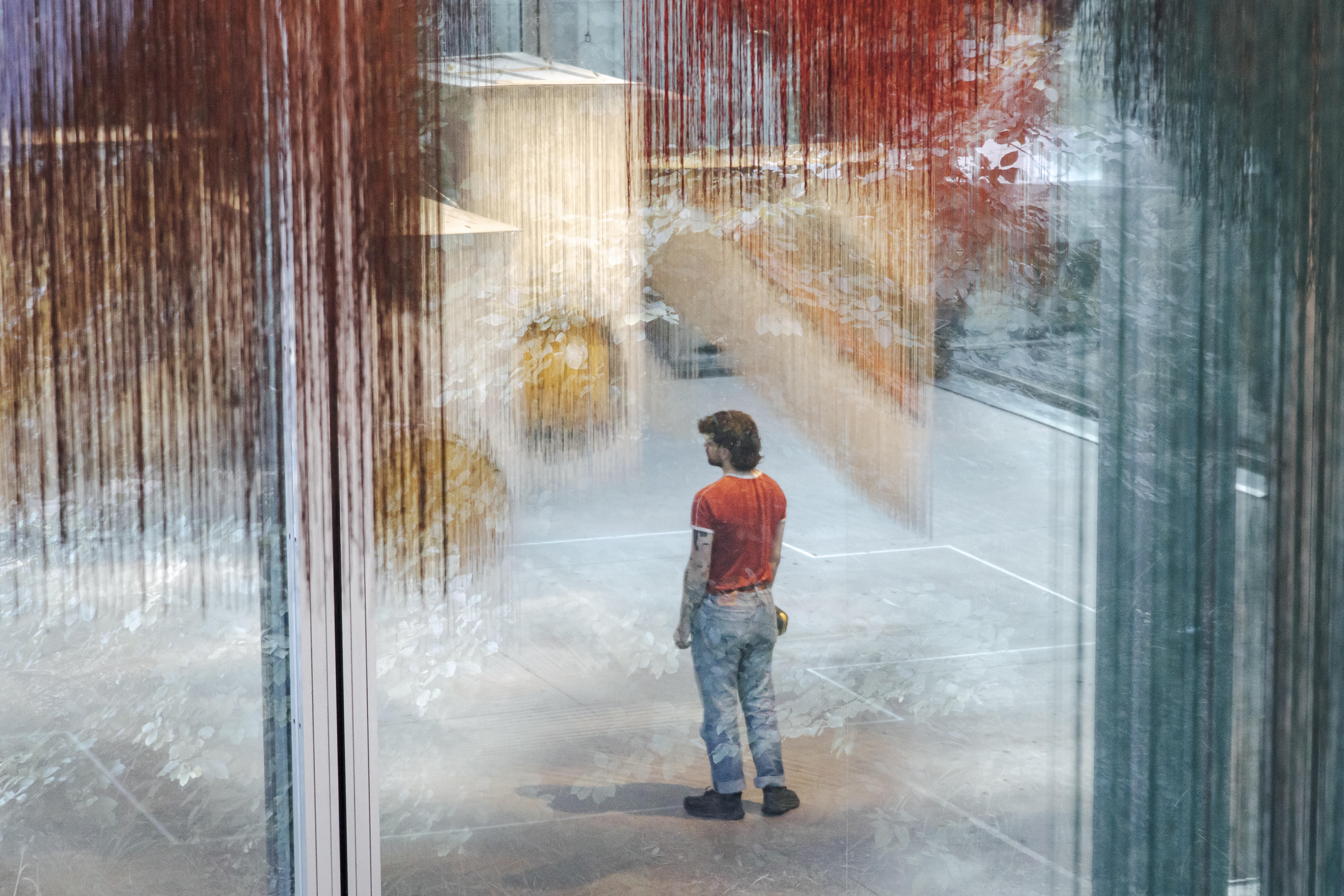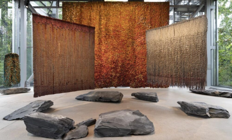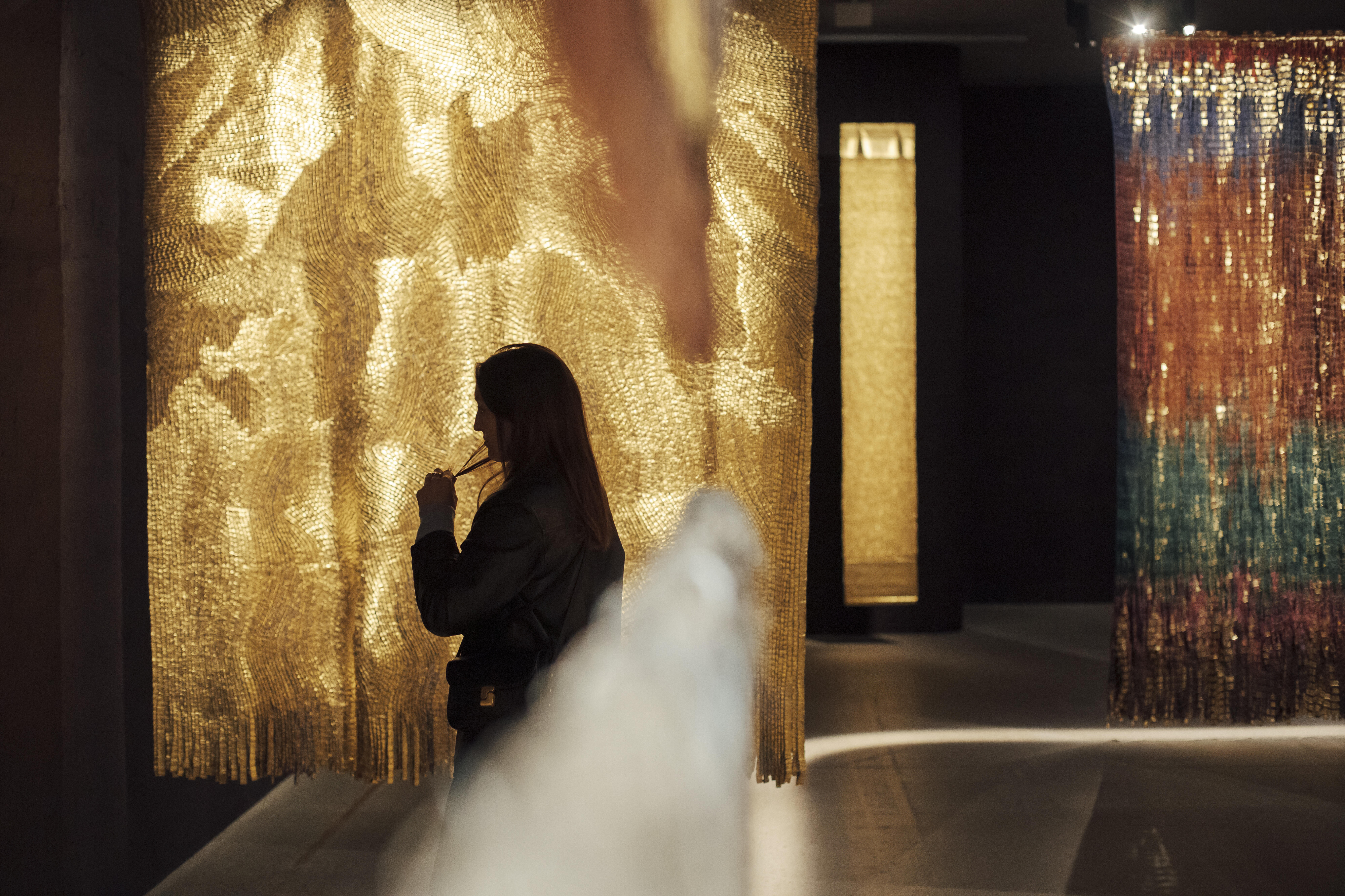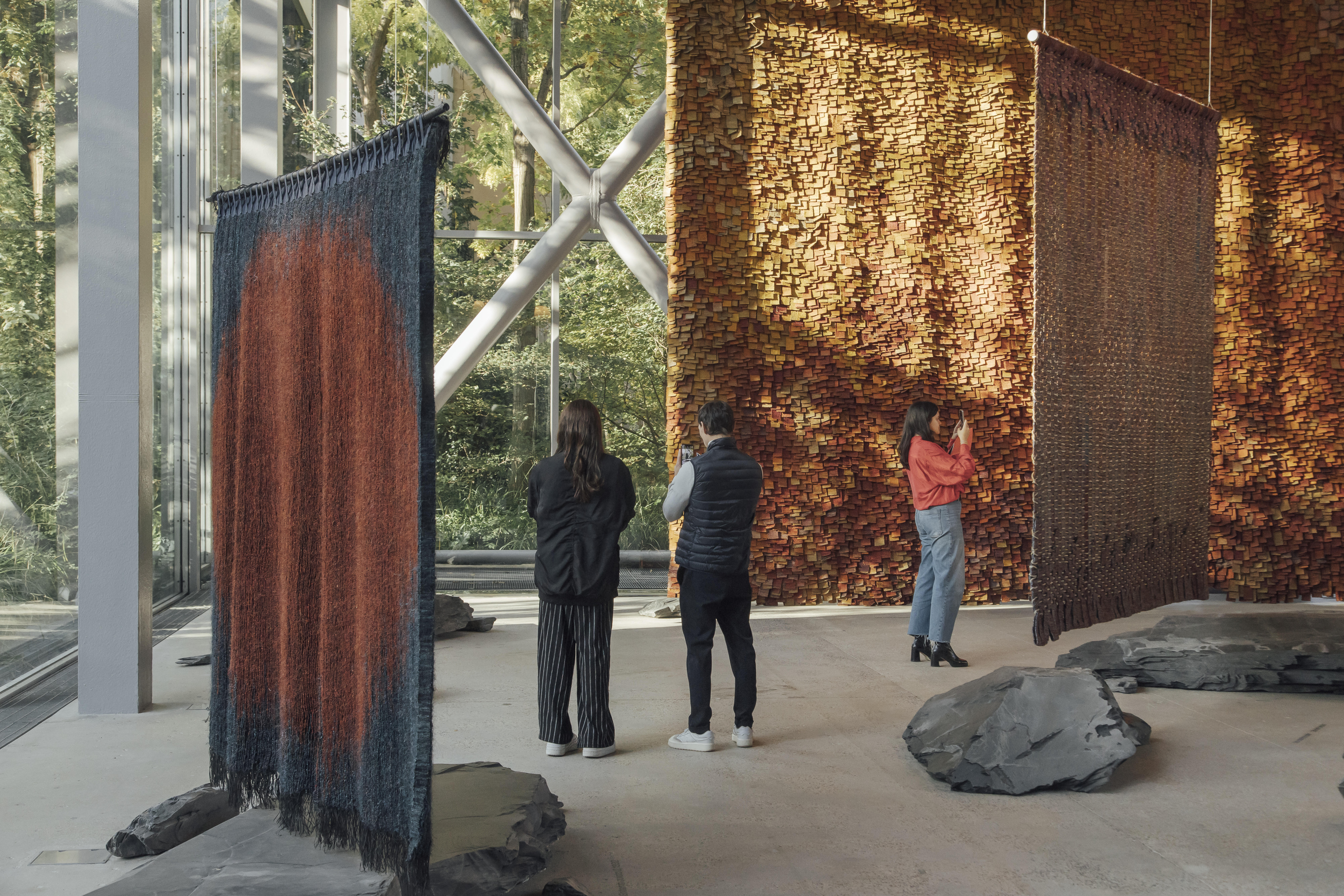 Il ne faut pas longtemps pour apercevoir les œuvres majestueuses d’Olga de Amaral. Quelques pas suffisent dans la Fondation Cartier pour l’art contemporain pour se retrouver nez à nez avec les immenses pièces de tissu, flottantes au-dessus de rochers, le tout bercé dans la lumière du soleil. Ces grandes œuvres textiles sont faites de lin, de coton et de feuille d’or. Elles s’affranchissent des murs et de l’image de la tapisserie pour modeler l’espace et faire architecture.