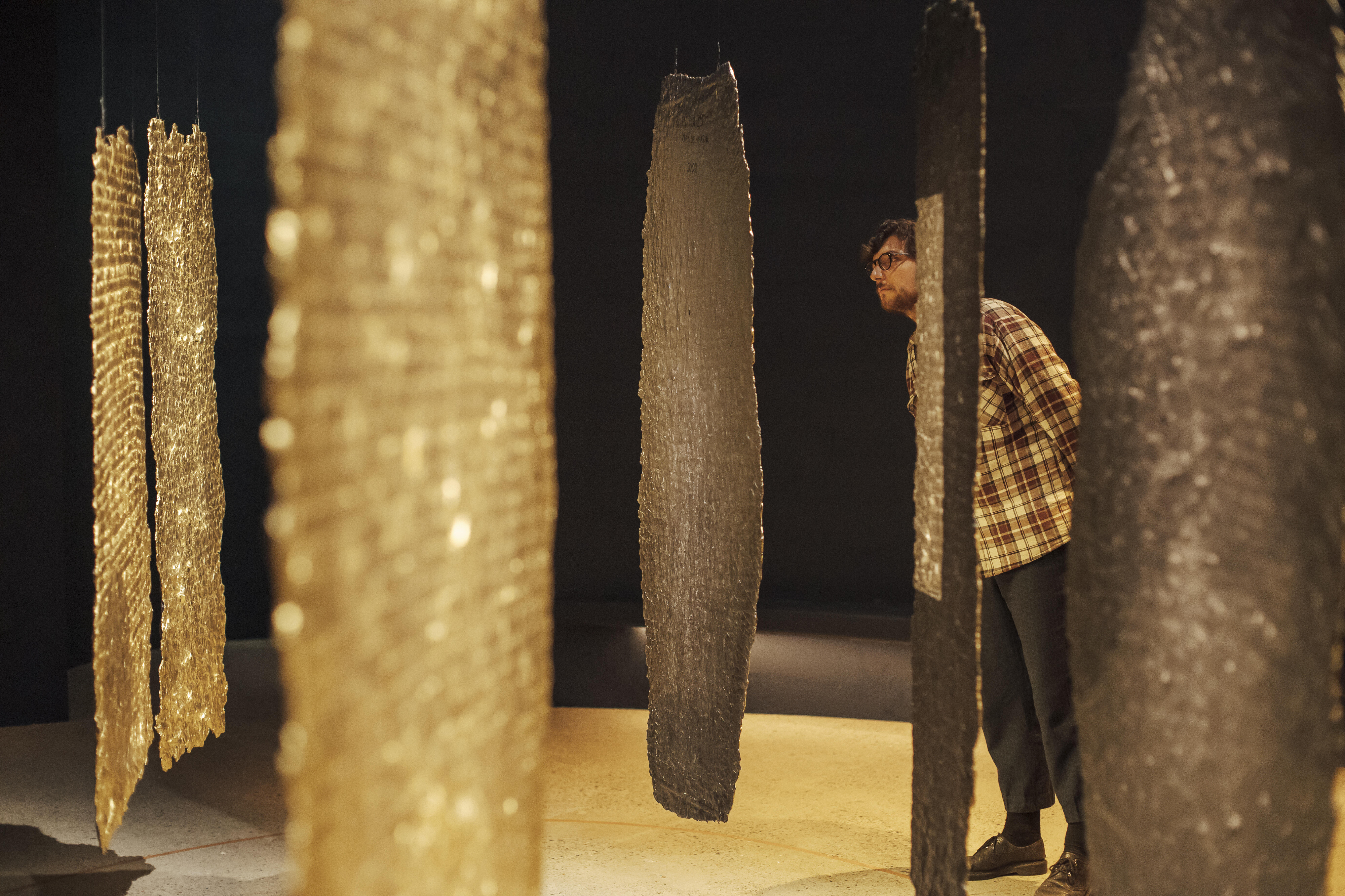 En déambulant au travers les œuvres de l’artiste colombienne, on devine aussi sa relation forte avec le spirituel. Au-delà de ses croyances, les installations suspendues – touchant presque au mystique – représentent des maillons entre la terre (la chair) et le ciel (l’esprit). Une spiritualité particulièrement présente dans la dernière salle de l’exposition, autour de l’œuvre “Estellas”. Des pierres stellaires précolombiennes en coton rigide, recouvertes de feuilles d’or, qui n’ont rien à envier aux menhirs de Carnac ou Stonehenge.