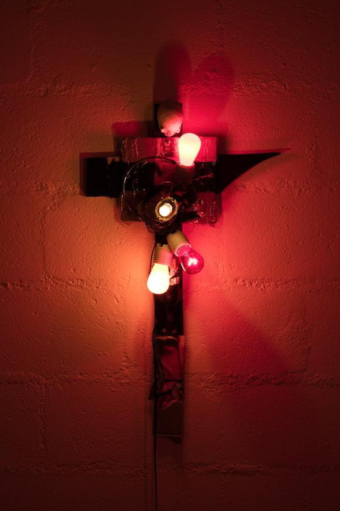 Vega est d’abord sorti d’école d’Art avec des visions urbaines. Un art de la récupération, du détournement. Il bricole des ex votos du Rock new-yorkais, avec des photos de jeunes boxeurs christiques, des fils électriques et des ampoules rouges, bleues, violettes…