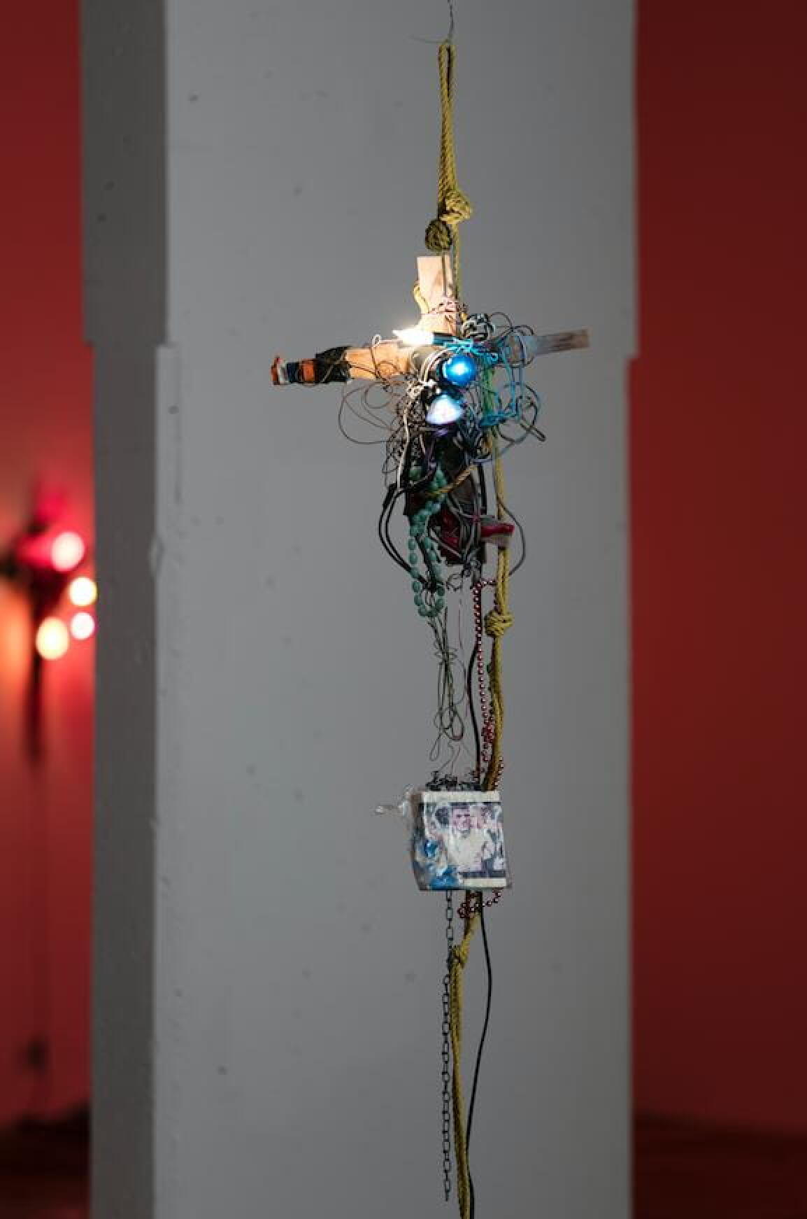 Comme les dadaïstes, un demi-siècle plus tôt, Alan Vega travaille avec ce qu’il ramasse par terre : fils électriques, barbelés, bouts de circuits électroniques, ampoules et diodes, images, journaux, commutateurs. Ces assemblages raffinés éclairés d’une lueur, sont comme des veilleuses, en hommage aux citoyens inconnus…