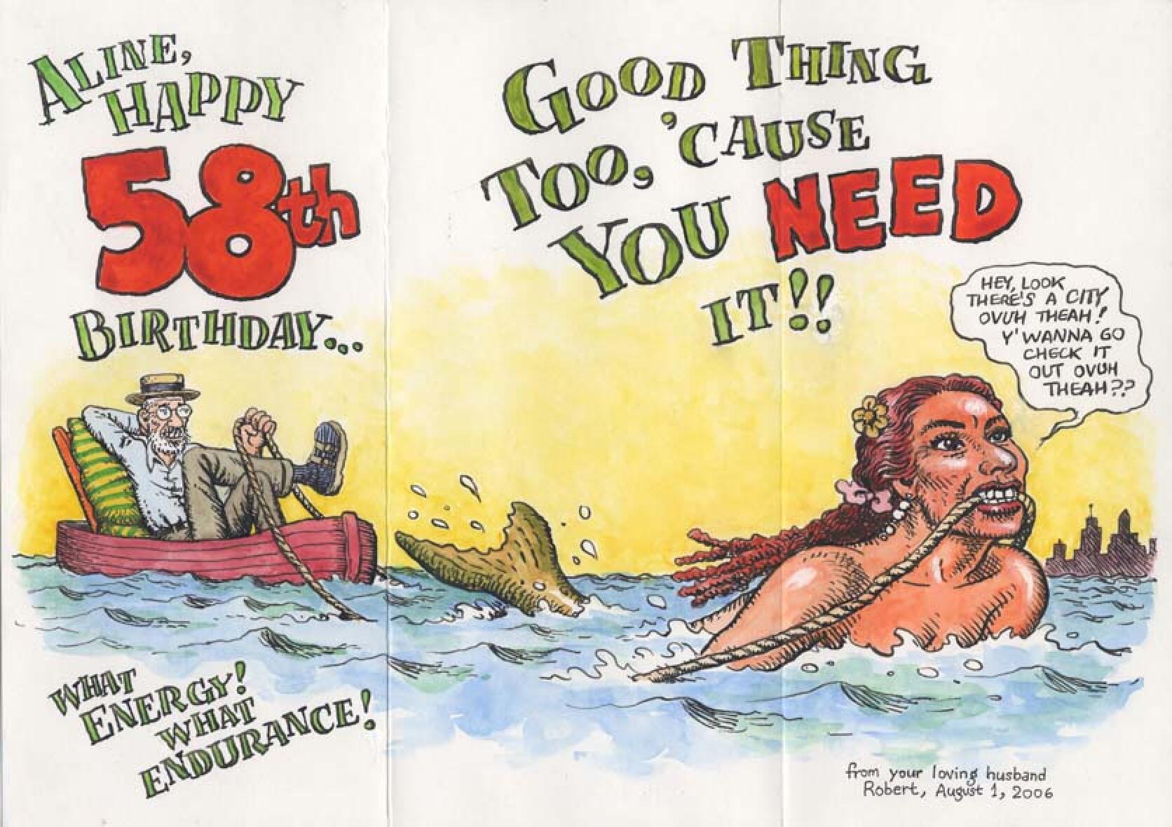 Aline Kominsky-Crumb :« Oh la la. C’est supporter quelqu’un au quotidien, avec toutes les douleurs et les joies, pendant quarante ans, sans être fidèle ou monogame, avec des enfants ou des ex-maris, tout en restant stimulé·e par l’autre, en prenant du plaisir à le/la voir matin et soir, ou après deux jours de séparation.