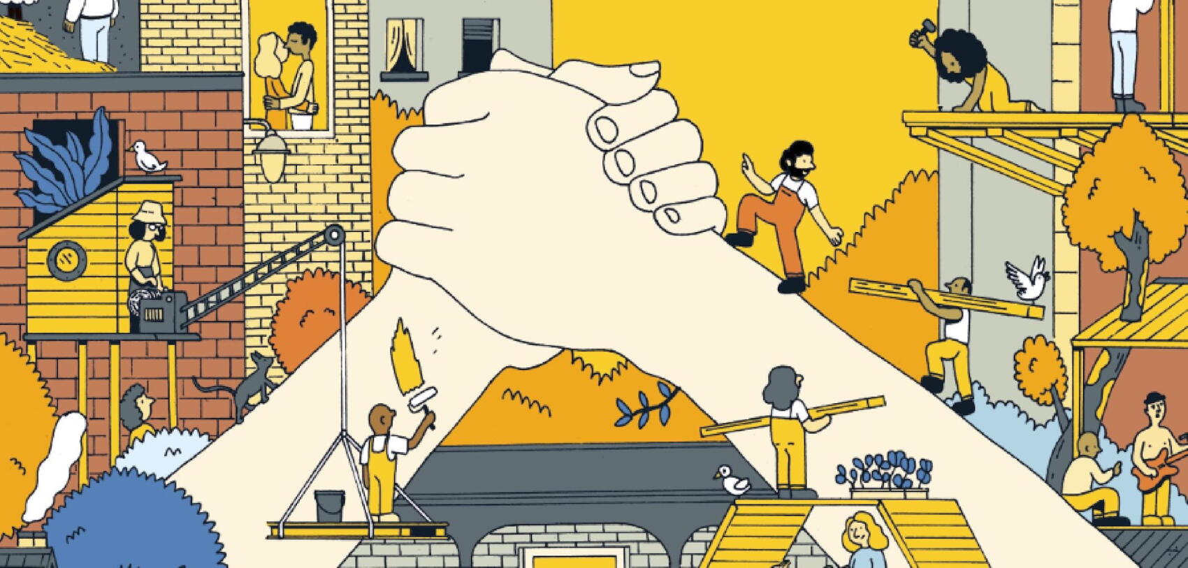 Image : détail de l’affiche du documentaire Les Grands voisins, la cité rêvée, de Bastien Simon (2020).