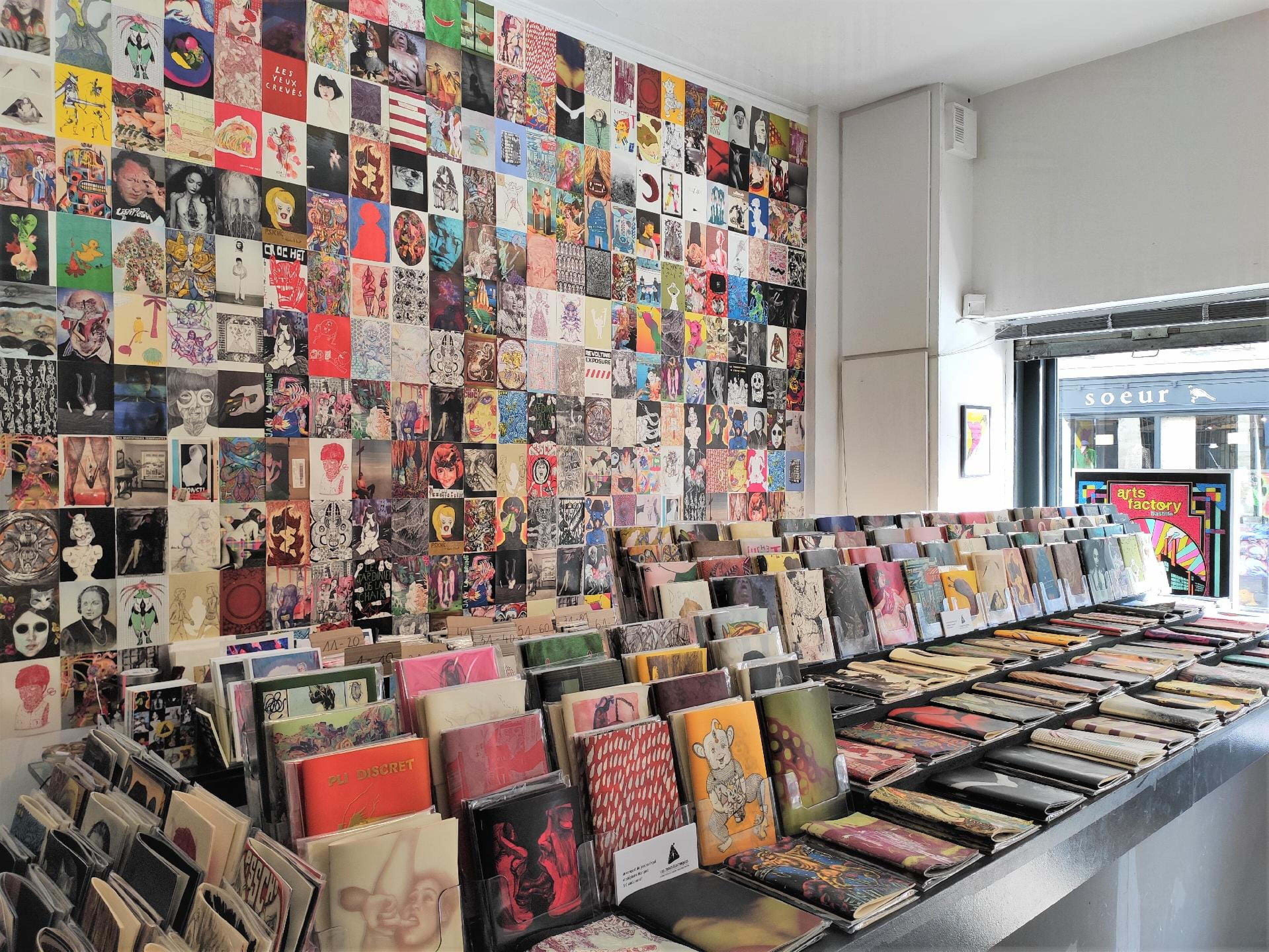 La librairie propose des œuvres en permanence et des livres, journaux, posters et de petits tirages des artistes de la galerie.
