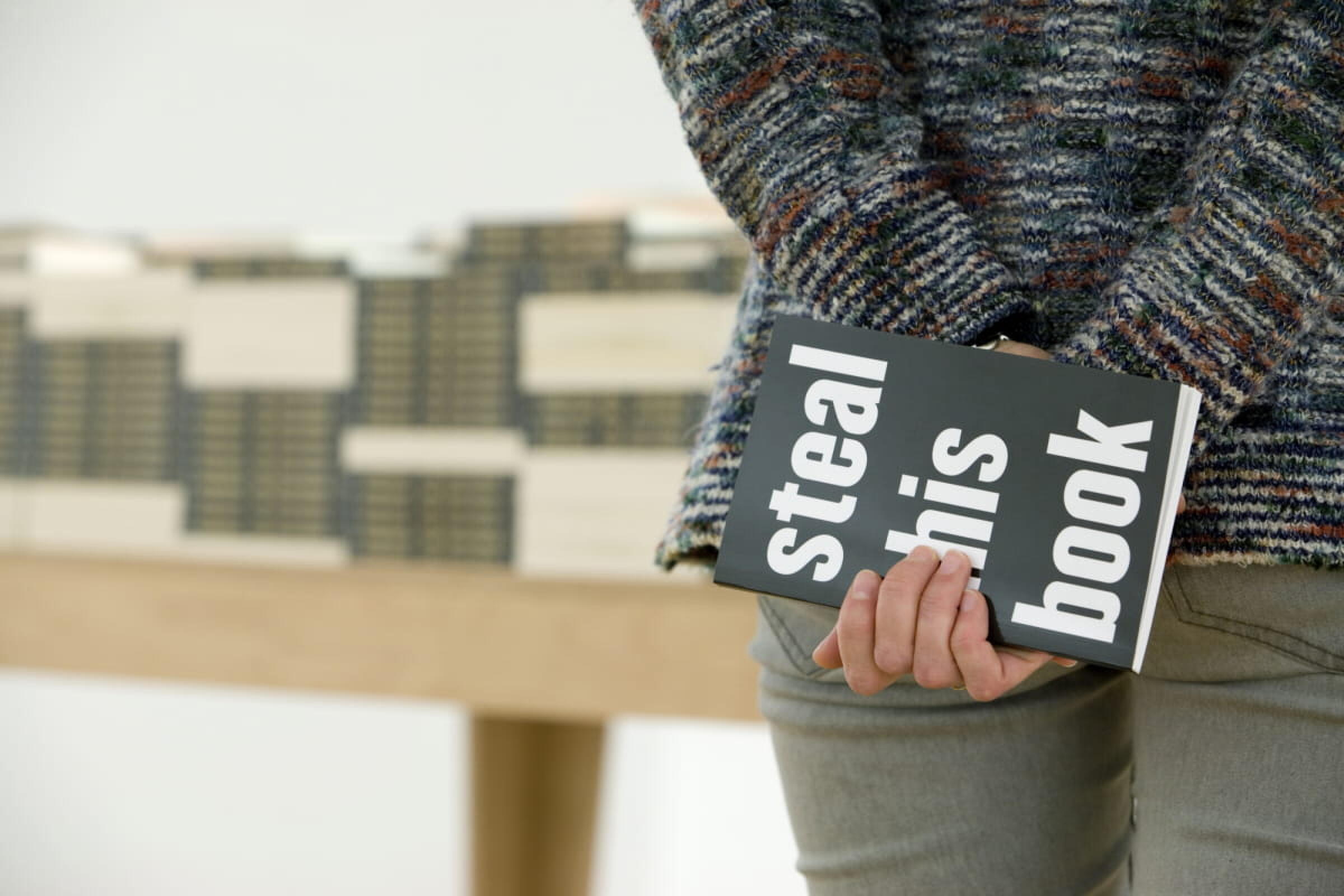 Il peut aussi s’agir de destruction, par le vol. Ici, c’est l’artiste espagnole Dora Garcia qui nous y encourage, une artiste qui pratique la vidéo, la performance et aussi l’écriture. En 2009, elle présente au Centre Pompidou son livre Steal This Book. À l’occasion d’une exposition, un certain nombre de livres étaient posés sur une table basse, avec, sur la couverture, la mention « Steal this book ». On a appris à ne rien voler dans les musées, alors, c’est compliqué. Mais la préface aussi, nous incite au vol. « Prenez donc ce livre, mettez-le dans votre poche, dans votre sac, et allez vous-en.» Bien évidemment, les livres se sont fait voler et l’œuvre a disparu.