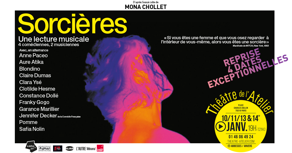 Pas de panique ! D’abord, parce qu’il n’est pas trop tard, mais aussi car en 2019, le collectif A Définir Dans Un Futur Proche, fondé par Elodie Demey, Mélissa Phulpin et Géraldine Sarratia, adaptait pour la scène la plume et la pensée de Mona Chollet sous la forme d’une lecture musicale intitulée Sorcières. Au plateau, des comédiennes et des musiciennes en alternance, des sorcières plurielles parmi lesquelles Anne Paceo, Clara Ysé, Clotilde Hesme, Pomme, Safia Nolin, Franky Gogo, Constance Dollé, Ariane Ascaride, Valérie Donzelli, Fishbach, Lucie Antunes, Léonie Pernet ou encore Mélissa Laveaux. Après un premier round couronné de succès à l’automne dernier, Sorcières est de retour pour 4 dates exceptionnelles au Théâtre de l’Atelier à Paris, du 10 au 14 janvier.