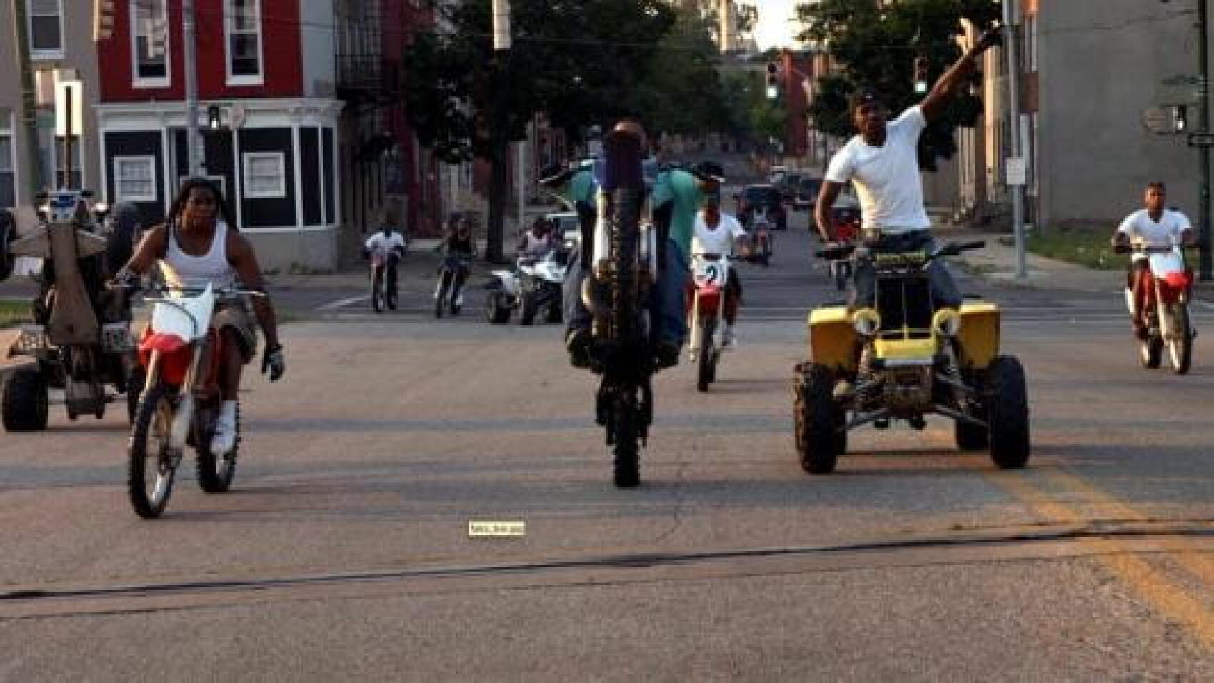 Des gangs de jeunes afro-américains sillonnent ainsi les quartiers de Baltimore en pratiquant des exercices de Wheeling, c’est à dire des roues arrières, se pavanant au nez et à la barbe des flics, ennemis numéros 1 et centre de toutes les haines mais que la législation n’autorise pas à chasser en voiture ces motards, du fait de la dangerosité d’une telle course poursuite.