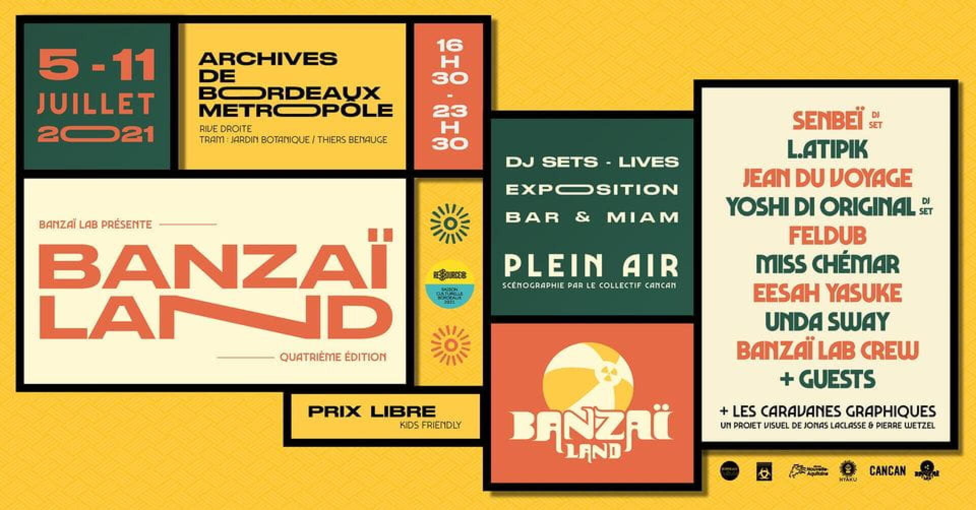 Après le commissariat Castéja, après la cour du Crédit Municipal, c’est sur le gigantesque parvis des Archives métropolitaines que le label bordelais Banzaï Lab édifie son ter-ter éphémère, hisse fièrement à la hampe son étamine frappée d’un logo rond comme un vinyle. Le nom de ce fief utopique, toutes frontières ouvertes, dont le moindre centimètre-carré porte l’empreinte des intentions conviviales du lieu ? Banzaï Land, quatrième apparition.