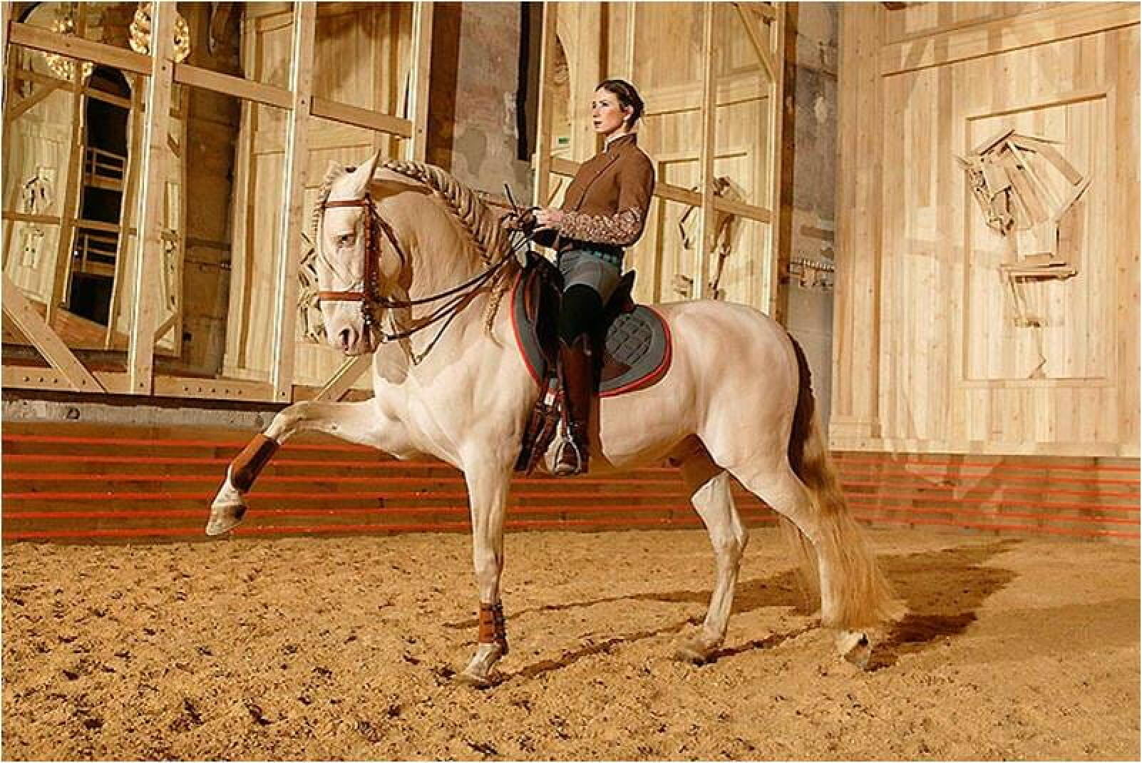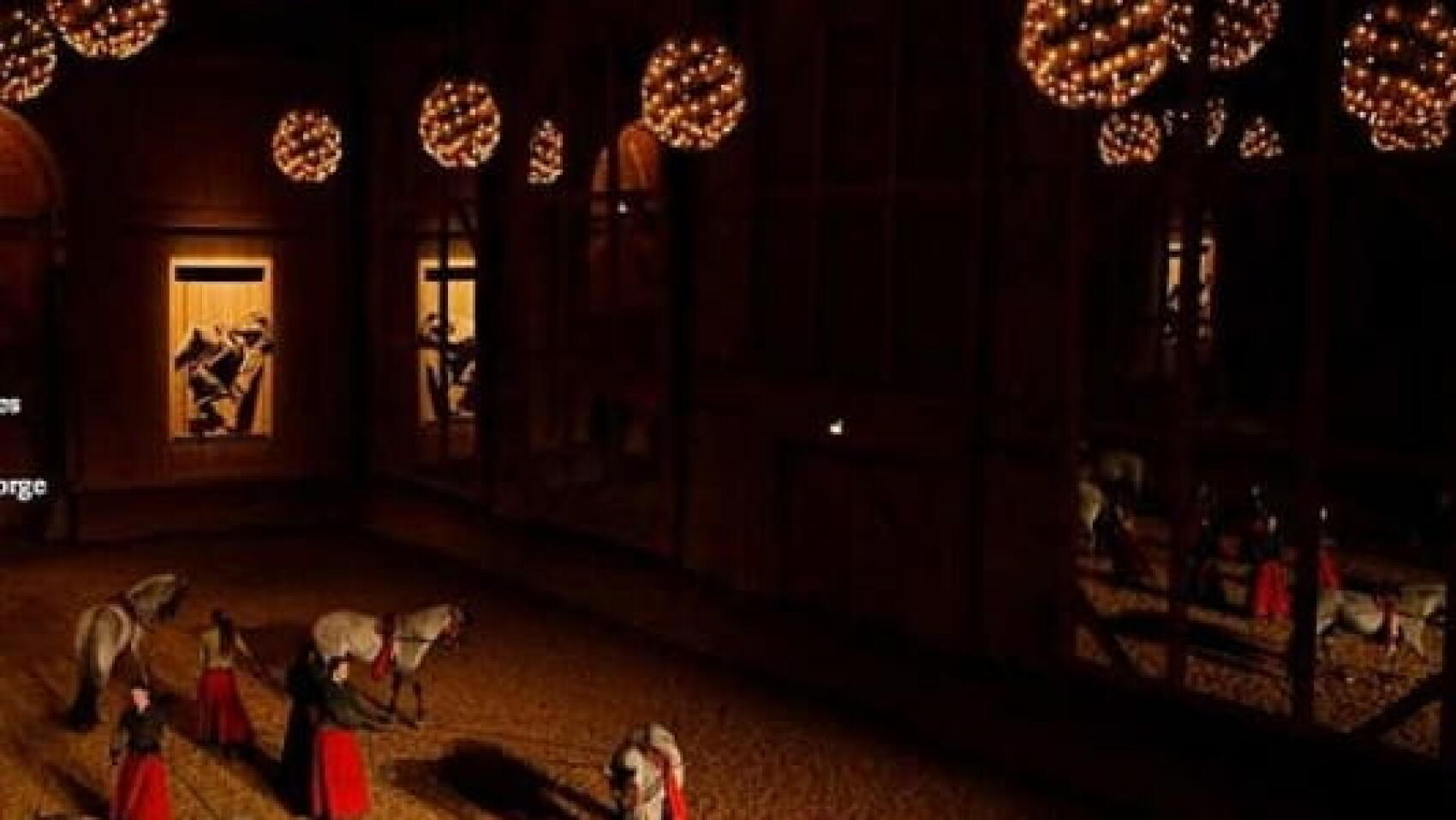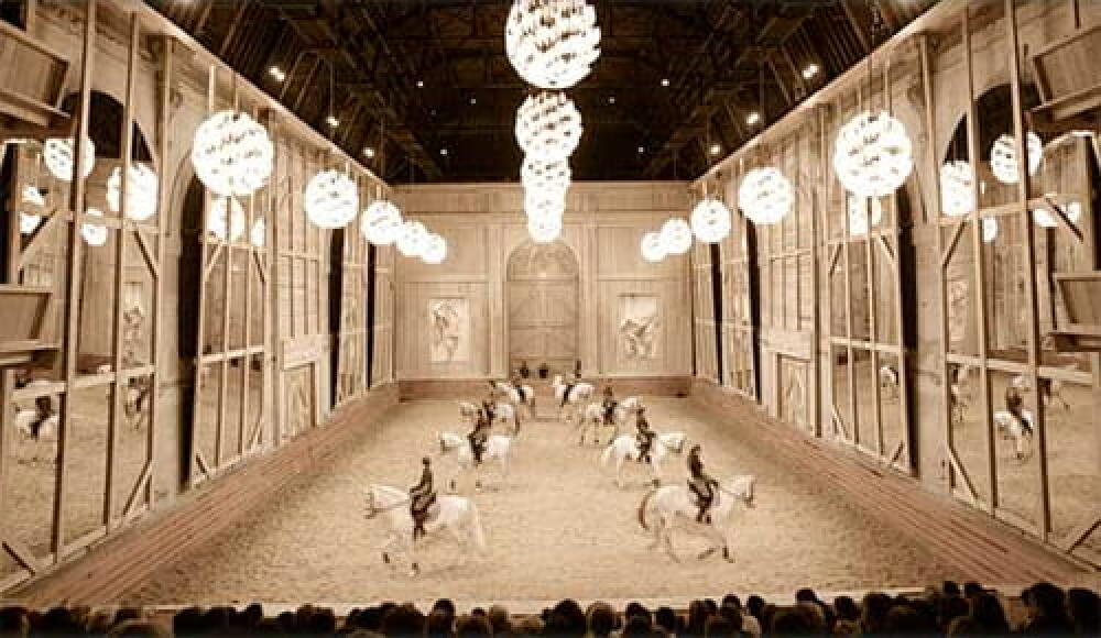 Pour le coup, ce sont deux portes qui s’ouvrent simultanément. Elles donnent dans une grandiose carrière d’équitation où des lustres plumeux dessinent des ombres douces. Le jour s’y invite quand entrent les chevaux racés, leur déroule un tapis lumineux où virevolte la poussière soulevée par le pas rythmé. Une gloire simple.