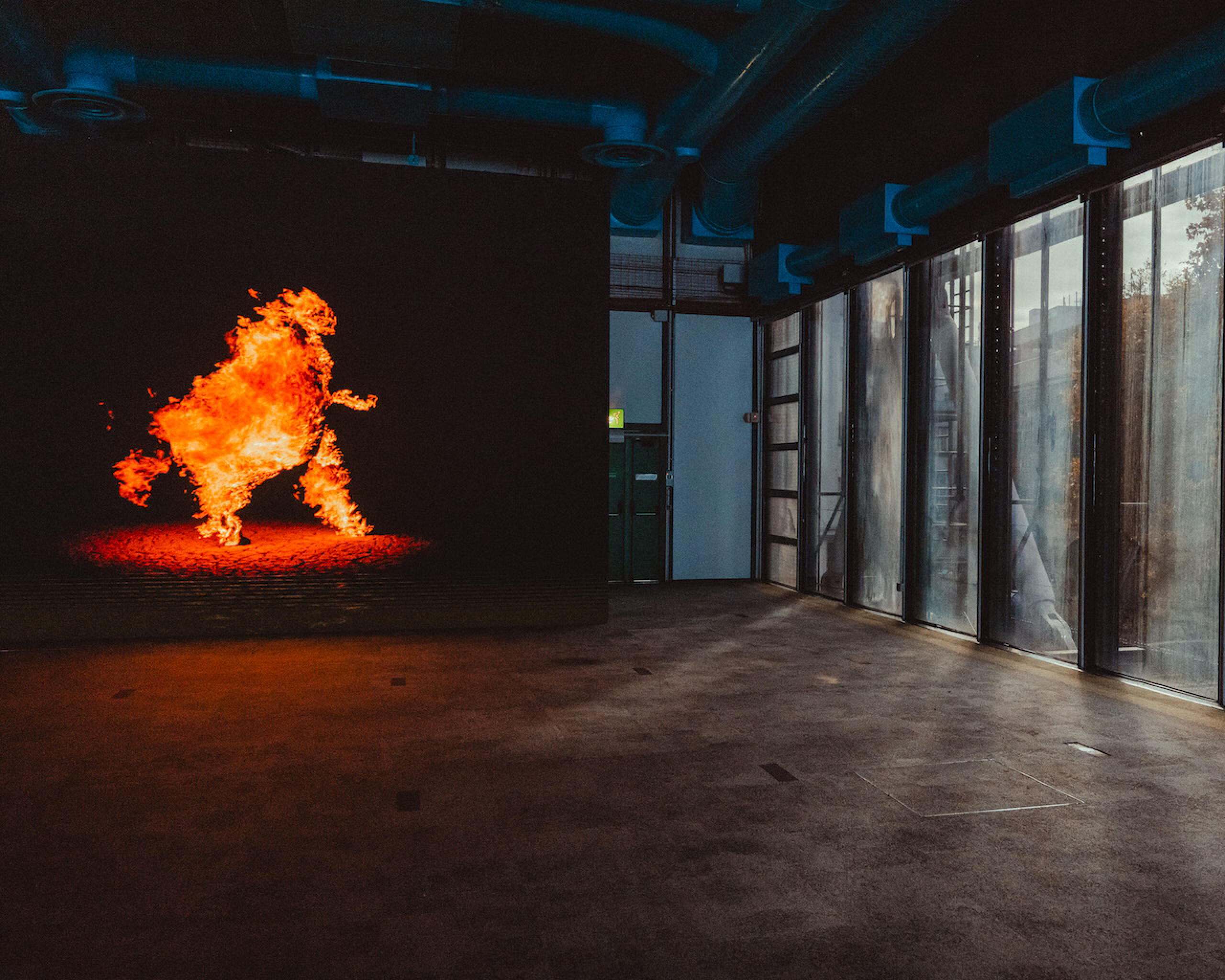 Depuis le hall, le long couloir d’accès mène jusqu’à l’installation de Thomas Bangalter (CAMERA / MAN). Deux écrans en vis-à-vis, minimalistes, diffusent deux vidéos tournées à 19 ans d’écart, et nous plongent dans une ambiance presque méditative, pulsée par une bande sonore ambient. Le visiteur entre, se laisse porter, puis s’arrête, se retourne. Le silence initial, la latence de la matière visuelle et sonore, tout concourt à créer une expérience introspective qui interroge le destin de l’Homme à l’aune de l’avènement de l’intelligence artificielle.