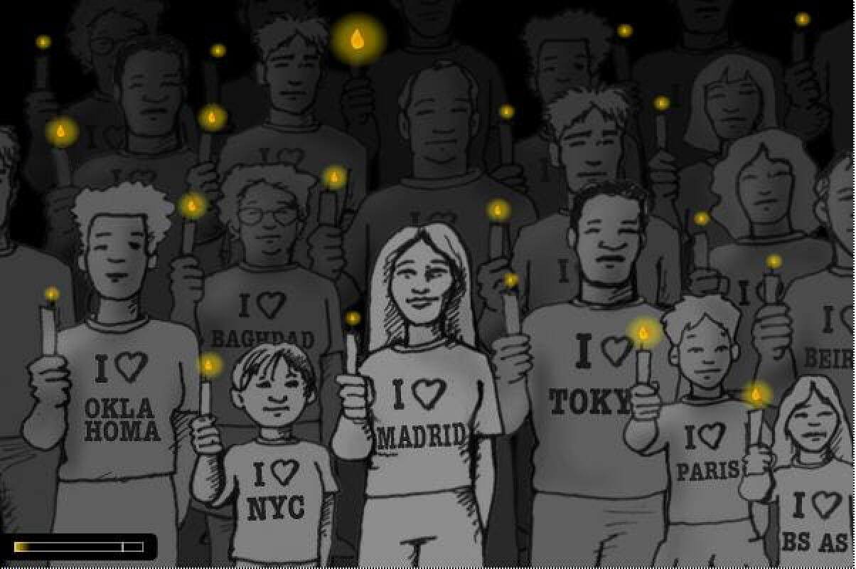 espagnole. Des personnages tiennent des bougies commémoratives et des t-shirts avec toutes les villes victimes d’attentats : vous devez cliquer sur toutes les bougies pour qu’elles ne s’éteignent pas. C’est un effort constant et infini de maintenir la flamme allumée, dès que vous lâchez, la flamme s’éteint et vous avez perdu.