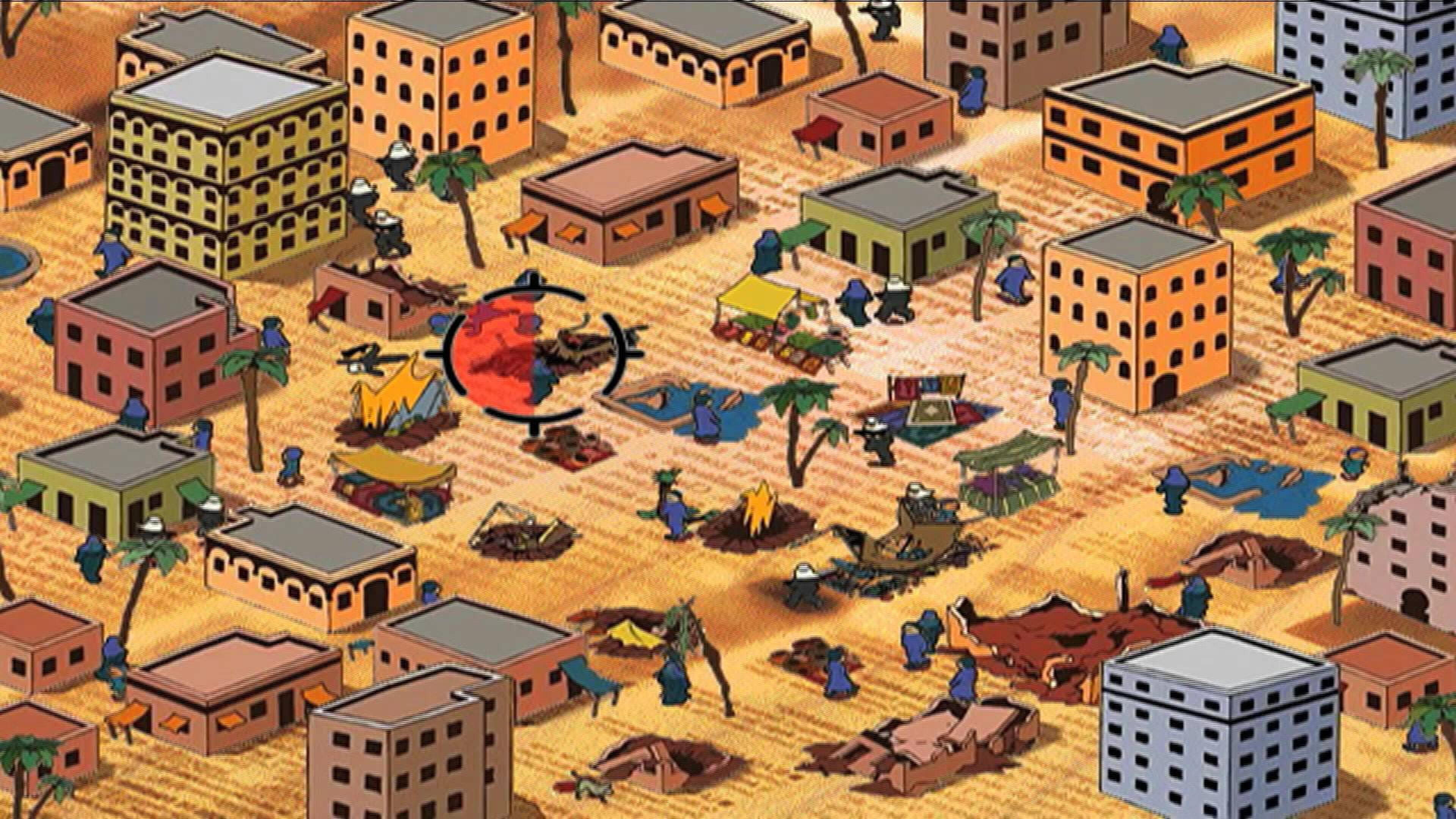 Vous êtes dans la peau d’un soldat américain qui bombarde un village au Moyen-Orient et vous devez viser des terroristes. Le viseur est très imprécis et à chaque frappe, des civils sont tués, on entend des mères pleurer. Les talibans se multiplient à chaque frappe jusqu’à occuper l’ensemble du village et de l’écran. Plus vous jouez plus vous perdez.