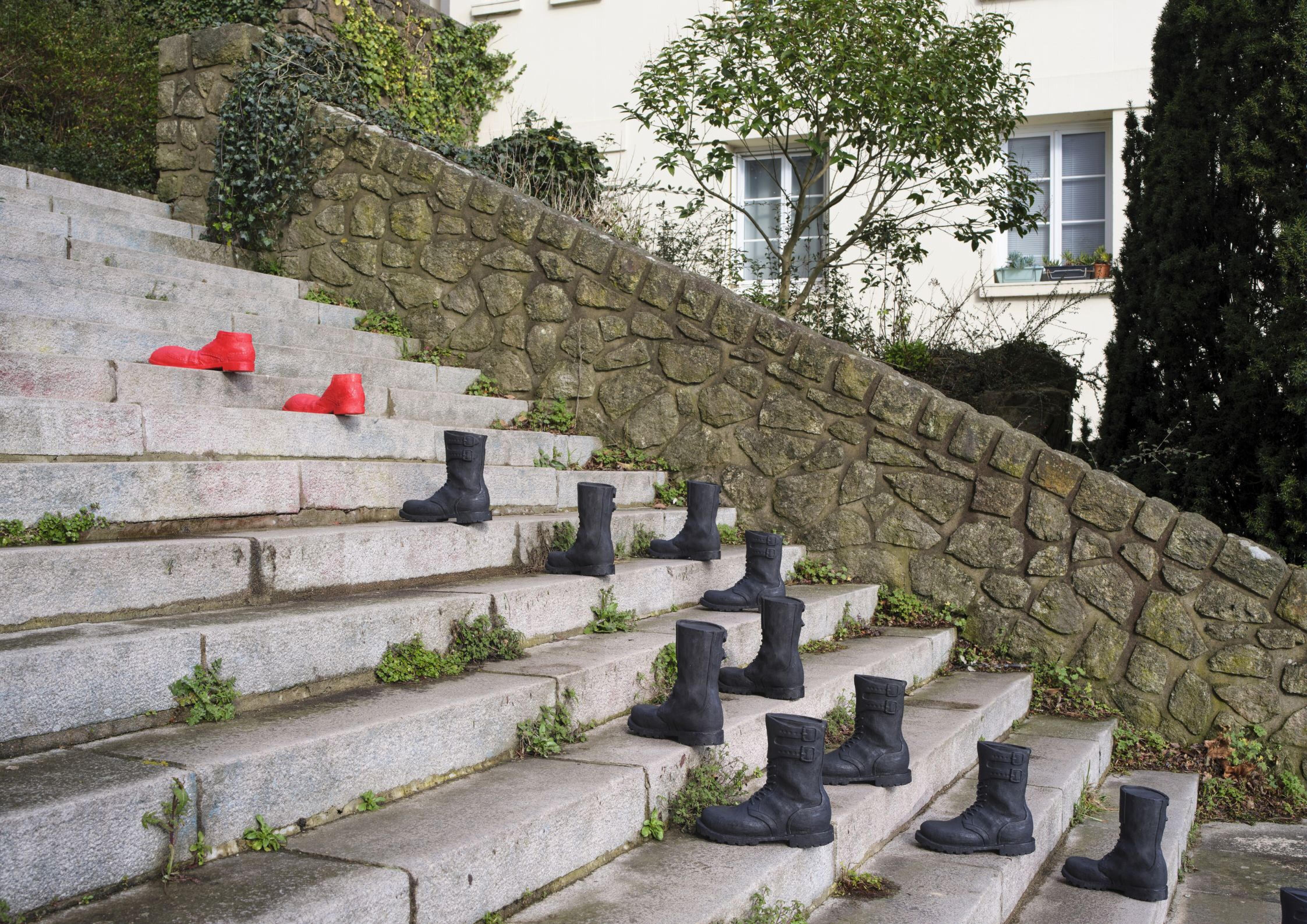 L’artiste a aussi installé une autre oeuvre, celle-ci sur l’un des escaliers de l’Hermitage, aux proportions assez monumentales. Sur les marches, progressent une vingtaine de paires de chaussures rangers noires, guidées par des chaussures de clown d’un rouge criard. Baptisée « Le bruit des bottes », l’oeuvre fait une référence directe à l’image utilisée pour parler de la montée du fascisme. « Je pense qu’on est dans une urgence où les messages subtils ne sont plus tellement d’actualité » affirme l’artiste.