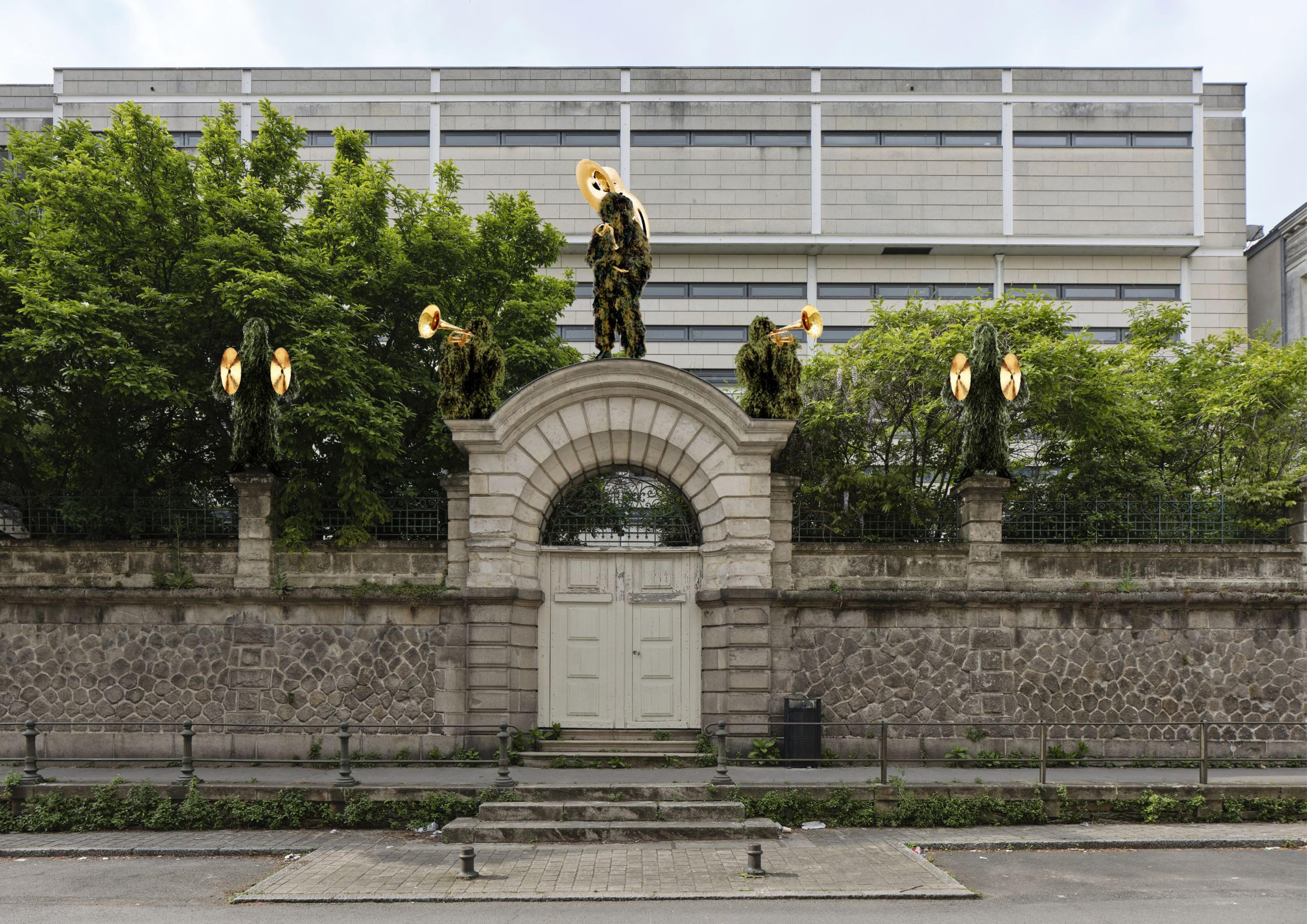 Plus loin, devant le lycée Clémenceau, on lève la tête et on aperçoit un autre personnage bien étrange, est-il poilu ? Touffu ? Il tient un cor luisant dans les mains, comme s’il s’apprêtait à nous jouer un air, appeler les troupes. « C’est une combinaison militaire de tireur embusqué » explique son créateur, Romain Weintzem. C’est l’un des six personnages de « La Mauvaise Troupe », titre de l’oeuvre disséminée dans la ville et clin d’oeil à la revue créée par un groupe d’élèves de ce même lycée en 1913. Dedans, ils publiaient des textes anarchistes, antimilitaristes, ce qui leur a valu d’être virés, sur fond de scandale national couvert par la presse jusqu’à Paris. « Un seul de ces élèves a finalement survécu à la Première Guerre », souligne Romain Weintzem, « donc ils avaient raison d’adopter cette posture antimilitariste finalement… »