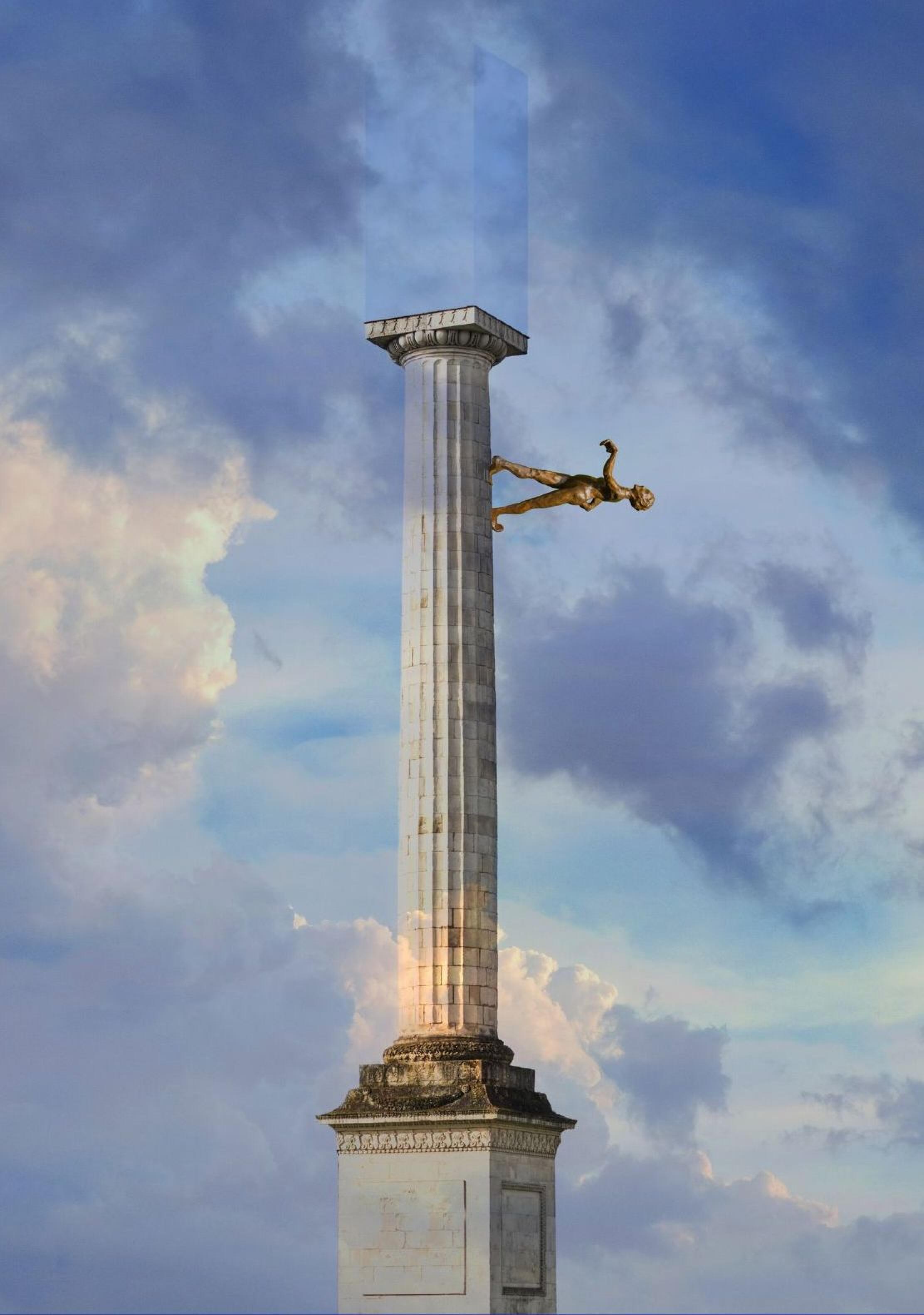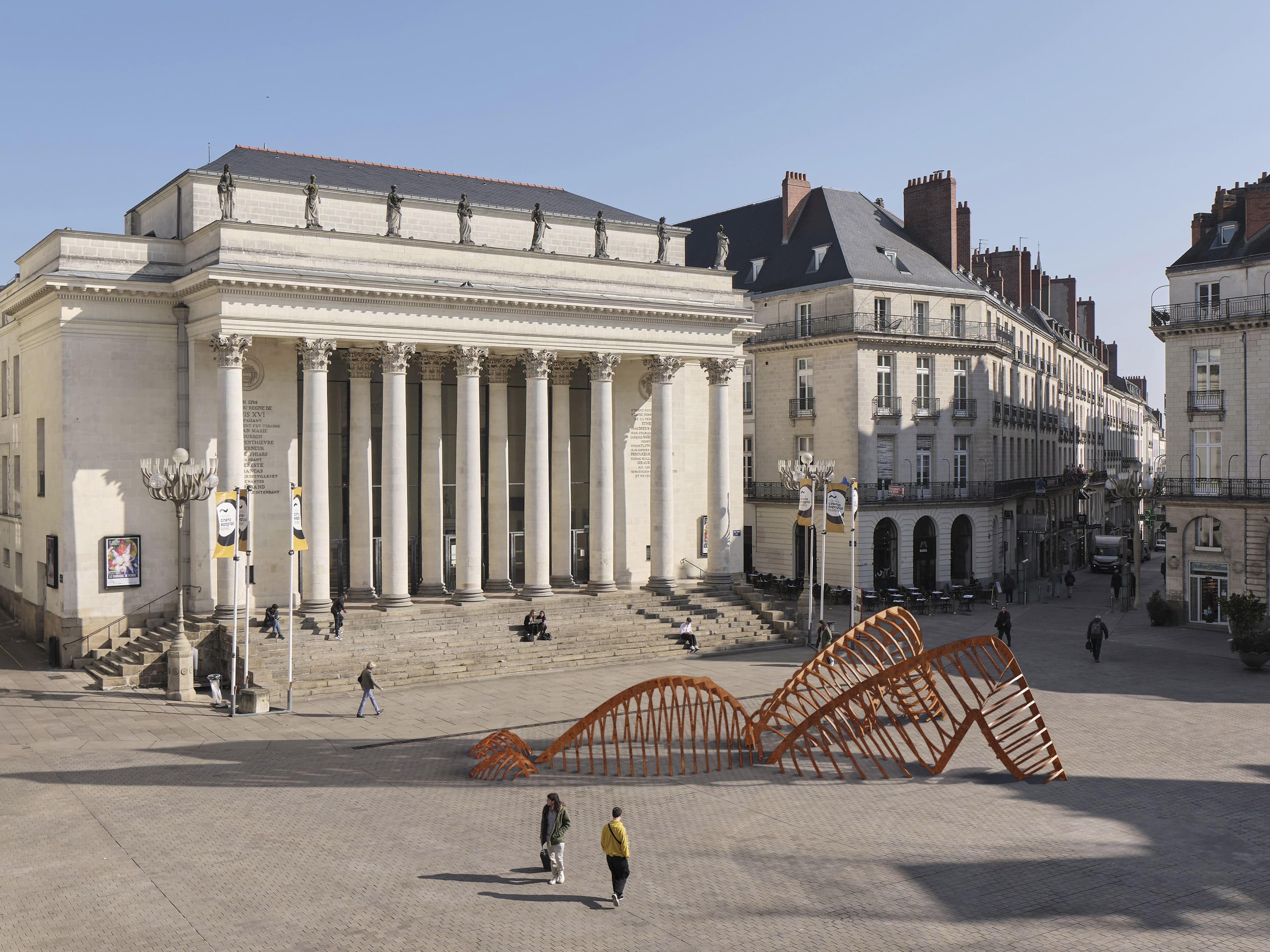 Cette œuvre raconte bien le parcours de cette année, les artistes se sont amusés à jouer avec les symboles. Ici, les allégories en bronze (qui profitent de l’expo pour aller se refaire une beauté puisqu’elles avaient cruellement besoin d’être restaurées), là-bas une colonne royale. Sur une autre place centrale de la ville, non loin d’une rue bien festive, celle du Maréchal Joffre, rien n’a été enlevé et pourtant… C’est étrange, c’est différent. Mais oui, il y a quelqu’un qui semble marcher vers le sommet de l’immense colonne de 28 mètres de haut de la place Foch ! C’est un « Antipodos », signé de l’artiste colombien Ivan Argote. Il a installé, sur une façade et sur la colonne, ce personnade aux pieds à l’envers, qui monte, ou qui descend donc, à vous de voir. À l’époque où l’on croyait la terre plate, le terme antipode, d’origine grecque, désignait un « territoire opposé ». Au Moyen Âge, on a cru que le terme voulait dire « avec des pieds retournés », et tout s’est confondu : on pensait que les gens qui vivaient à l’autre bout du monde avaient les pieds à l’envers. L’oeuvre d’Ivan Argote, c’est d’abord une réflexion sur l’Étranger, mais aussi un jeu avec cette colonne : et si cet Antipodos grimpait jusqu’en haut et prenait la place de la statue de Louis XVI ? Un jeu qui fait en plus écho à l’Histoire, puisque la colonne est restée sans statue pendant 30 ans, entre 1790 et 1823.