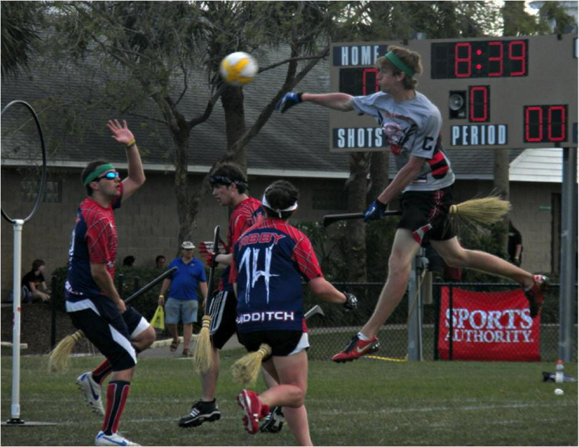 Dans le livre, j’avais beaucoup de mal à imaginer un match de Quidditch . Avec, notamment, la présence de 5 balles sur le terrain, 6 arbitres et une diversité de postes, ce sport semblait être d’une complexité inouïe. N’en déplaise à une bande d’étudiants de l’université de Middleburry, qui ont relevé le défi avec brio. C’est pour occuper leur dimanche après-midi qu’ils se sont retroussé les manches pour adapter ces règles. Même formation que dans le livre : le poursuiveur et le gardien essaient d’envoyer le souaffle à travers les anneaux adverses.