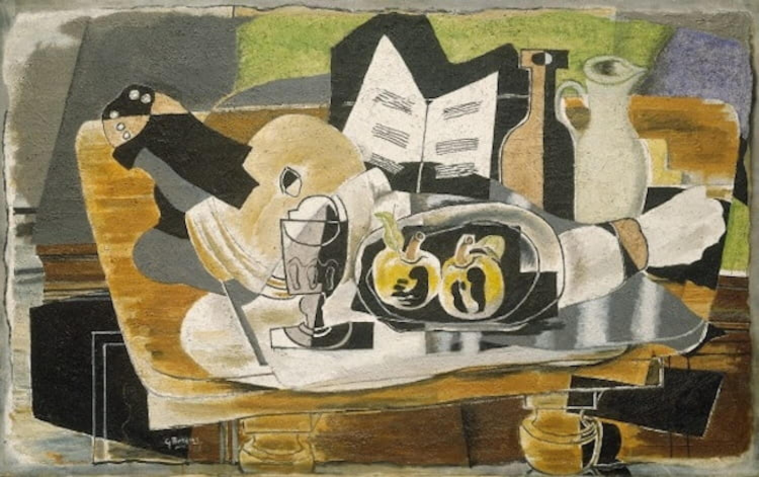 Mais Braque est un calme. Il continue de chercher des idées et ses natures mortes où les objets s’entremêlent et changent de forme sont des réussites, à nouveau reconnues. Les toiles sont superbes, équilibrées, statiques et fortes : elles s’imposent par leur composition et toutes les trouvailles de dessin.