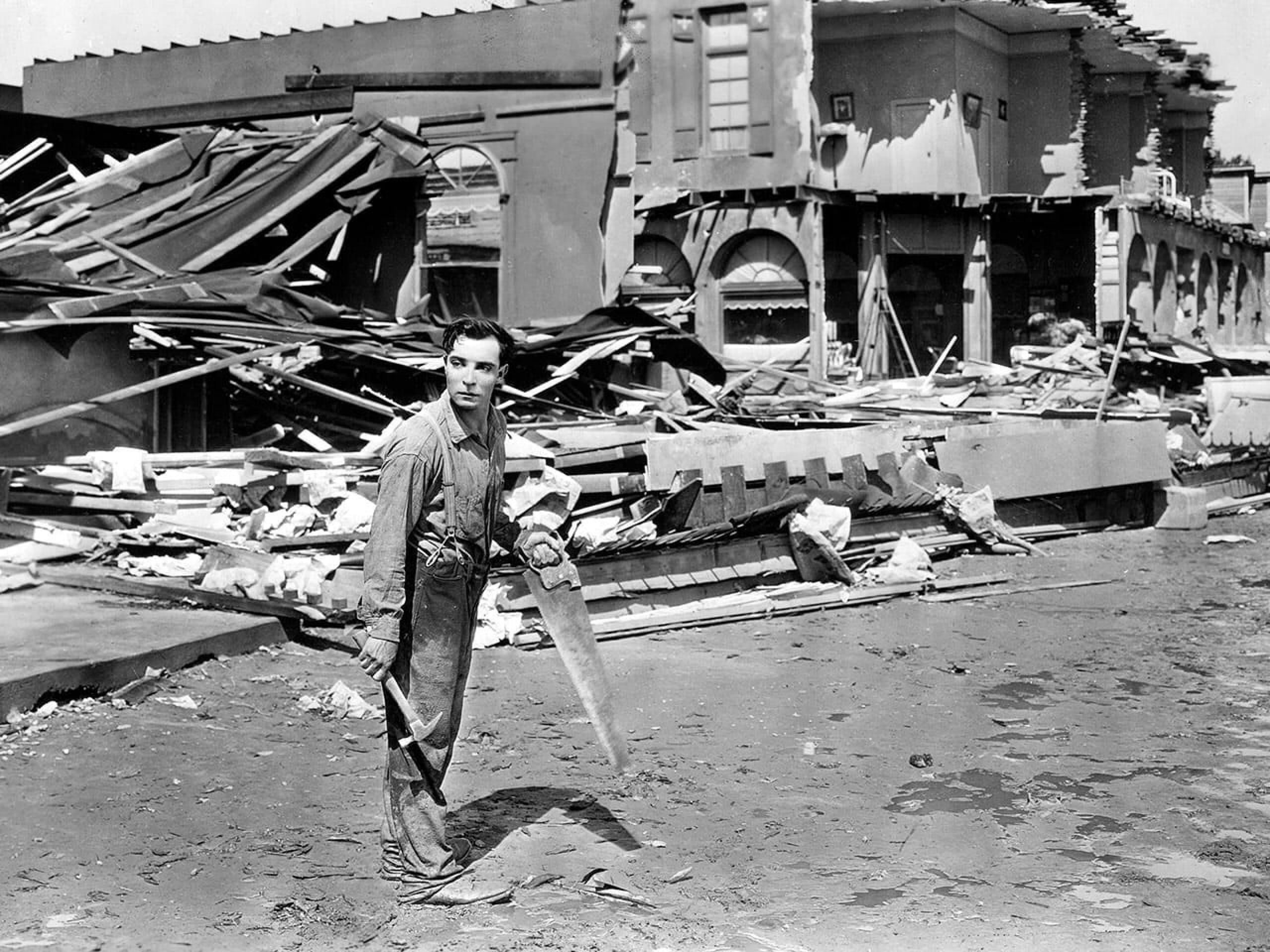 Des coups comme ça, Buster Keaton en fait sans arrêt : il échappe à 1 000 morts, à un poil près, sous nos yeux effarés, avec de vrais accessoires lourds, dangereux : il joue au Mikado avec des troncs d’arbres, des camions le frôlent, il saute entre deux immeubles et dévale le mur en s’accrochant partout jusqu’en bas, sans casse !!!