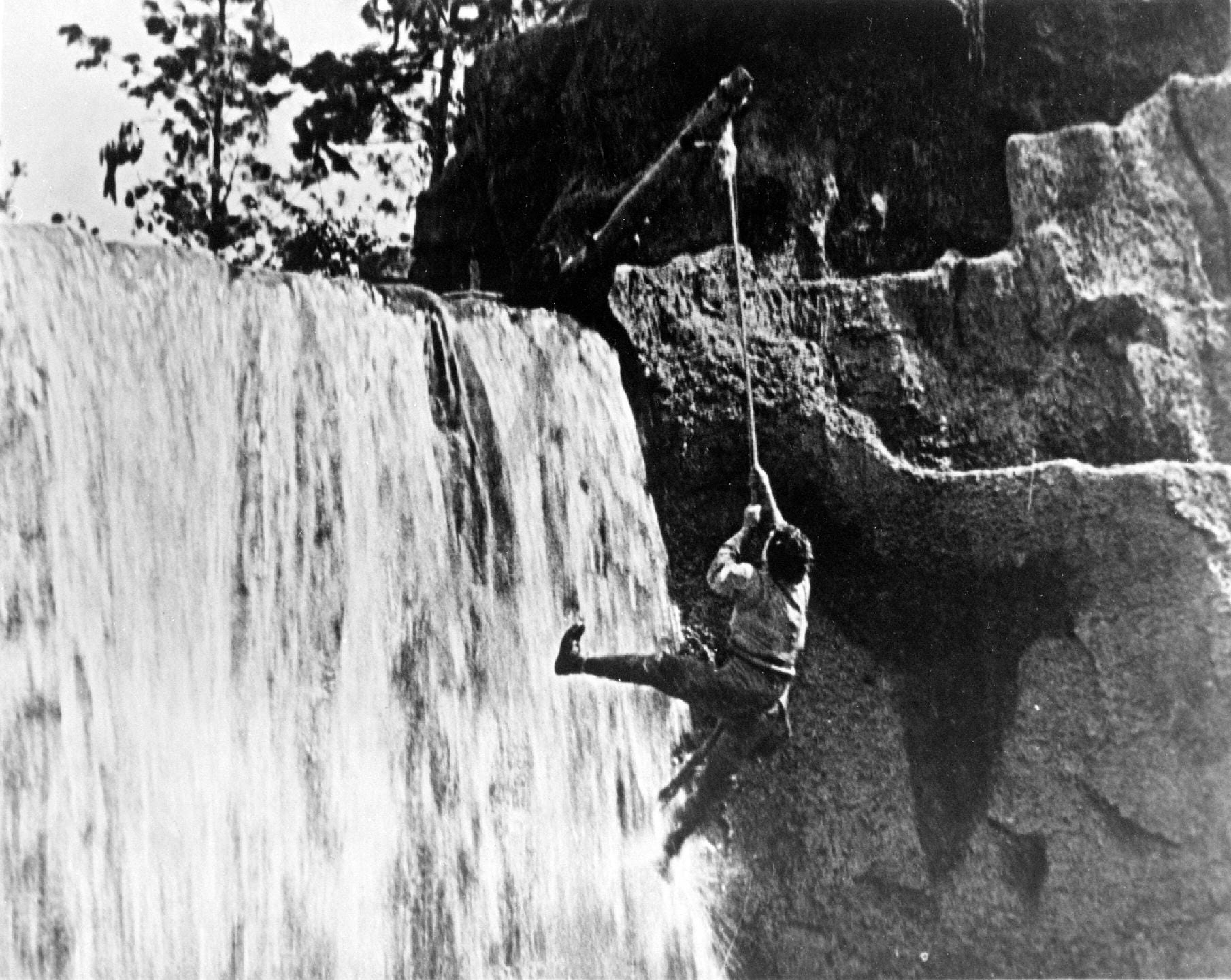 Dans une scène où il fuit avec sa fiancée, celle-ci dérive dans une barque sur des rapides, tandis qu’il est empêtré dans une corde accrochée à un tronc. Le tronc se bloque au bord de la cascade, et il va se balancer au bout de la corde, afin de récupérer la fille, juste au moment ou la barque bascule dans le vide, puis la jette sur des rochers, exactement comme un numéro de trapèze minuté !!!
