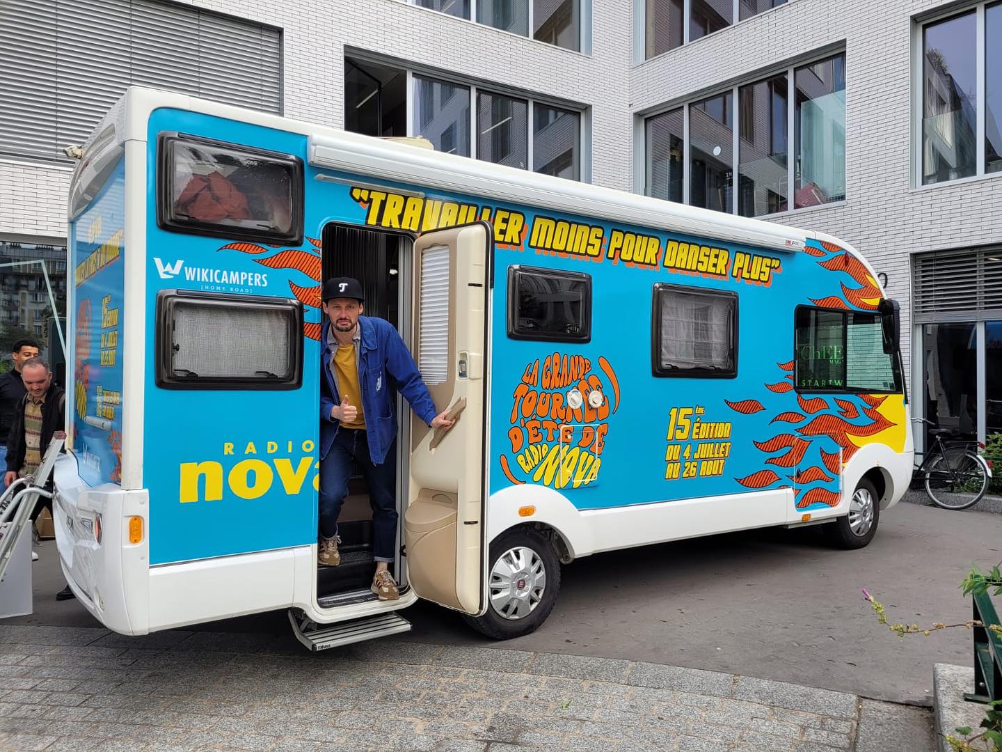 Commençons par mentionner, et ça nous concerne au premier chef, la présence sur les lieux de la caravane de la Grande Tournée. Après avoir sillonné les routes des vacances, à ses risques et périls, après s’être arrêtée à Rennes sous l’égide pataphysique d’Alfred Jarry, après avoir visité Rouen, Lion-sur-Mer ou Marseille, le traditionnel bivouac estival de la Radio Nova s’établira (sans s’y ensabler) sur les grèves canaulaises, prête à enflammer tous les azurs comme l’indique la livrée de notre véhicule itinérant, à mirer ci-dessous.
