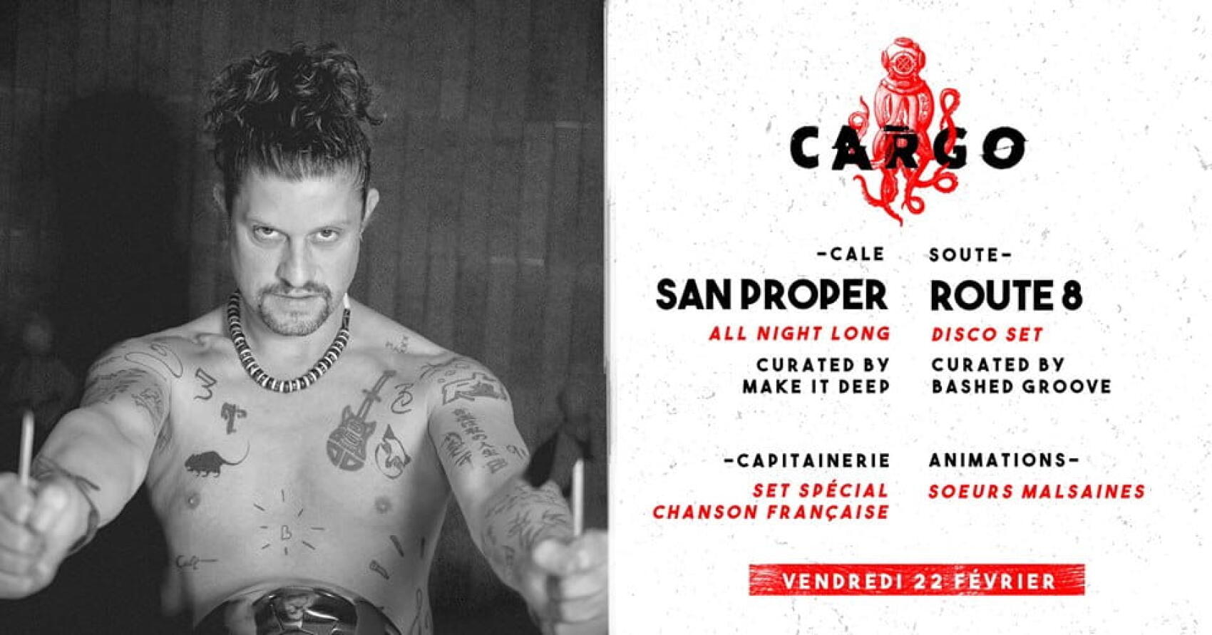 Ce vendredi 22 février, ce sera le Cargo et ses 10 000 tonnes d’acier qui se feront témoin de toutes vos exubérances. Et absolument personne n’est mieux placé pour vous faire danser sauvagement toute la nuit que le maître de l’exubérance même : San Proper. Une sélection léchée de vinyles et des dj sets toujours extrêmement dansants. Alors préparez vous parce qu’il a pas prévu de se reposer pendant ce set qui dure all night long.
