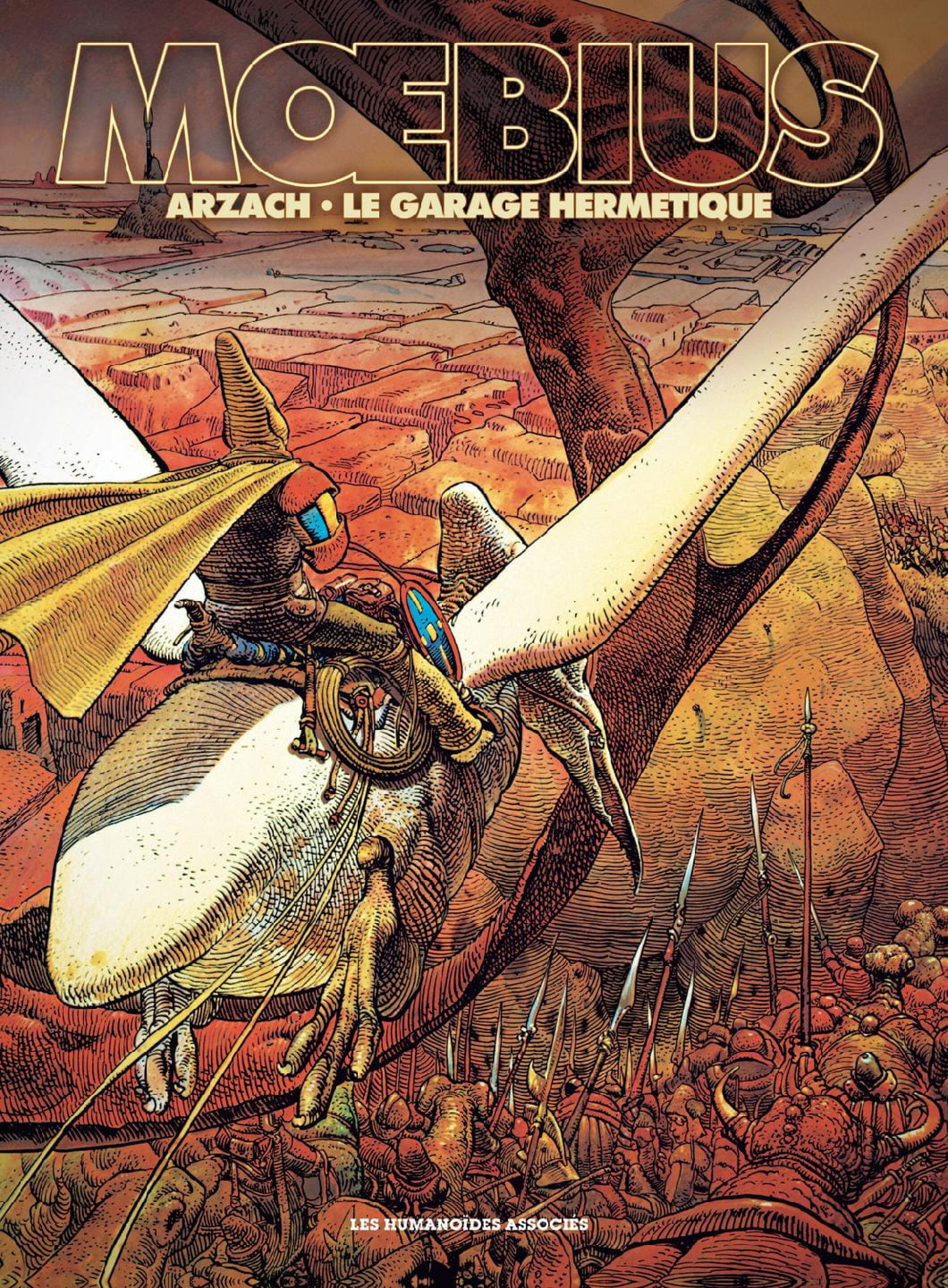 Le titre complet du Garage, c’est : Le Garage hermétique de Jerry Cornelius, qui est un personnage créé par l’écrivain britannique Michael Moorcock [héros pop de quatre romans d’espionnage, 1968-1977]. Moebius, à cette époque, est un grand lecteur d’Isaac Asimov ou de Philip K. Dick. Le Garage est un mélange de plein de choses qu’il aime dessiner ; par moments il y a des cow-boys, par moments des super-héros, par moments juste des paysages désertiques et montagneux. Il compare cela à ce qu’ont fait John Coltrane ou Miles Davis, en laissant dériver leur jazz vers quelque chose de, non pas déstructuré, mais structuré autrement, avec d’autres paramètres, pour ne pas dire d’autres règles. Les règles ne sont destinées qu’à tomber. Le Garage, c’est une fausse histoire d’aventure, avec tous les signes extérieurs d’une aventure : des cavaliers, des vaisseaux, donc on semble être en terrain connu. De plus, le dessin est relativement classique : les personnages sont proportionnés de manière réaliste – à l’exception de quelques pages où, d’un seul coup, le Major Grubert se retrouve avec des proportions humoristiques, avec un gros nez. Moebius prend des libertés avec son dessin exactement comme un musicien qui, à un moment, va utiliser son instrument de manière inadaptée à la musique qu’il est censé jouer.