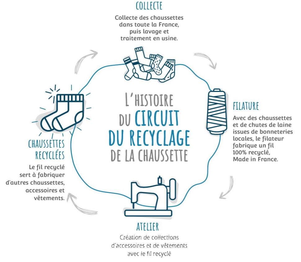 Toute la collection, au-delà des chaussettes, est fabriquée à partir de chaussettes recyclées: usagées ou orphelines, elles sont collectées, triées, effilochées et transformées en un nouveau fil 100% recyclé. En plus d’avoir un impact très positif sur la planète (1 kg de chaussettes recyclées c’est 25 kg de CO2 émis en moins), la marque promeut les petites entreprises françaises (une partie de la collection a le Label « Fabriqué à Paris ») et s’engage dans l’insertion sociale des femmes en Centre d’hébergement d’urgence, en organisant des ateliers créatifs d’insertion ainsi que et des animations pédagogiques auprès des enfants du quartier de la Goutte d’Or.