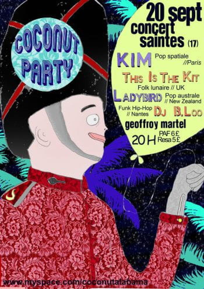 Cette salle, difficile à exploiter, ils tentent de l’incarner en la décorant de ballons de baudruche. Tous les anciens du lycée sont mis à contribution  : Simon et Simon débutent dans le son et lumières, ils s’en chargent naturellement. Bambi et Charlotte sont étudiants aux Beaux-arts, à eux la déco. Que la famille. À l’affiche, This is the kit (déjà  ! on la retrouve dans la programmation cette année), Kim, Angelo Spencer, et Ladybird, le groupe de Victor Crespi, aujourd’hui administrateur de l’association Coconut (une affaire de famille on vous dit). Parce que «  l’essentiel c’est la com’  !  », les jeunes gens pleins d’élan tapissent d’affiches les murs de la capitale saintongeaise. Et réussissent à rameuter 250 personnes. Coconut est né.