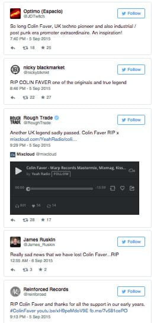Un des grands noms de l’underground, résident du Heaven et du WAG a quitté cette terre et sa musique. Colin Faver était considéré comme un grand pionnier de la House post-Punk en Grande Bretagne, véritable figure de l’histoire de cette musique mais il était aussi un homme de radio qui avait pour volonté de transformer sa notoriété en un tremplin extraordinaire pour les artistes émergents. Il demeurera un véritable symbole d’ouverture d’esprit et de diversité musicale. Grand DJ des ondes de la radio-pirate KISS (100 FM) qu’il a fondée, il a vu les plus grand passer devant son micro durant toutes les années 90 : Kraftwerk, Derrick May, Juan Atkins, Aphex Twin, Kevin Sauderson et tant d’autres… C’est dans le cadre de cette émission qu’il permettait aussi aux auditeurs de lui envoyer leurs mix de moins d’une demi-heure pour proposer de jouer quelques morceaux à l’antenne. ce qui permettait au répertoire de ce curieux polymorphe et boulimique de musique d’être en constante évolution. Chaque soir, au menu c’était donc tout aussi bien techno et trance, qu’ambient et expérimentale !