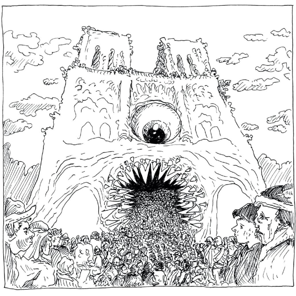 En larmes depuis les fenêtres de son atelier, témoin bouleversé de l’incendie qui ravagea la cathédrale en avril 2019, Damien MacDonald s’est attelé à l’adaptation BD du chef-d’oeuvre de Victor Hugo, « au plus près » des intentions de l’auteur, sans réécrire ce texte qu’il juge encore, deux siècles après sa parution, « inouï ». Sur plus de 330 pages en noir et blanc réalisées à l’encre de Chine et publiées cette semaine aux éditions Calmann-Lévy, cet auteur-dessinateur franco-écossais, dont le trait clair et le goût pour l’organique et les mythologies peuvent s’apparenter à Moebius, reste fidèle aux mots du maître tout en laissant libre cours à sa fantaisie surréaliste et sensuelle, qui s’échappe des tours comme de la gorge des gargouilles.