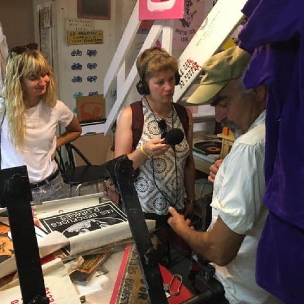 Dernier épisode en compagnie de Sarah Fouassier, dont le Lyon City Guide : Art Urbain, qu’elle a écrit et illustré de ses photographies, est un instantané du street-art dans les rues lyonnaises. Or si elle aime photographier les murs qui parlent, elle adore également photographier les gens : des inconnus dans la rue, à qui elle « vole des instants intimes », comme elle dit, ou bien des personnes dont elle connaît la gueule, comme son ami Papy Art. Un personnage haut en couleurs qu’elle vous emmène justement voir, et qui vous fait visiter son atelier de sérigraphie rue Burdeau, où il imprime des messages libertaires sur à peu près tout et n’importe quoi.