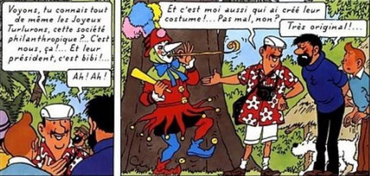 Mes recherches m’ont amenée à constater quelque chose de très étrange. Le masque de Guy Fawkes, créé dans les années 80 ressemble très très étrangement au masque des joyeux turlurons dansTintin et les Picaros écrit en 1976. Le nez est légèrement plus long mais c’est tout. Séraphin Lampion arrive avec ses joyeux turlurons, groupe folklorique pour fêter le carnaval à Tapiocapolis.