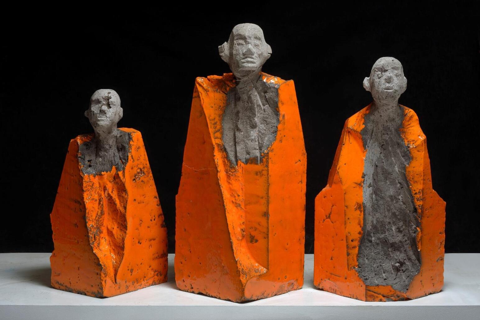 Multidimensionnelle, elle l’est à plusieurs égards. Question d’échelles, capables de tutoyer l’intime comme l’imposant, l’humble comme le considérable. Question de familiarités, de proximités, oscillant entre différences et correspondances. Question, aussi, de temps et de matière, qui croisent leurs feux, travaillant la tension qui électrise les rapports de l’immuable et du mutant, tels deux silex qu’on entrechoquerait. Il y a tout cela au fil de ces deux cents oeuvres taillées dans la roche, les laves, les orgues basaltiques, le granit, la diorite. Un peuple de statues, abruptes présences minérales, âpres et hétéroclites, aux visages déconcertants et à la parole arrêtée juste avant le dicible, étonnante parfois de polychromie – des gris bien sûr mais aussi des oranges, des blancs, des bleus – et de patines aussi, tantôt polies, tantôt balafrées, grenues, tantôt émaillées, avec une application et une technique qui forcent le respect.