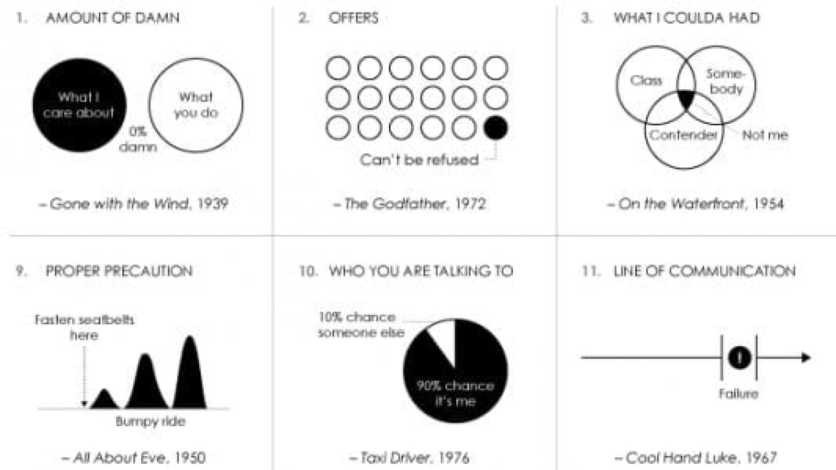 Amis cinéphiles, statisticiens et infographes, bonjour ! Voici une nouvelle qui devrait vous réjouir, et enthousiasmer au passage tous les amateurs de petites énigmes. Le site FlowingData a en effet référencé 100 dialogues mémorables de films cultes et les a illustrés à l’aide de graphiques. Saurez-vous les reconnaître ?