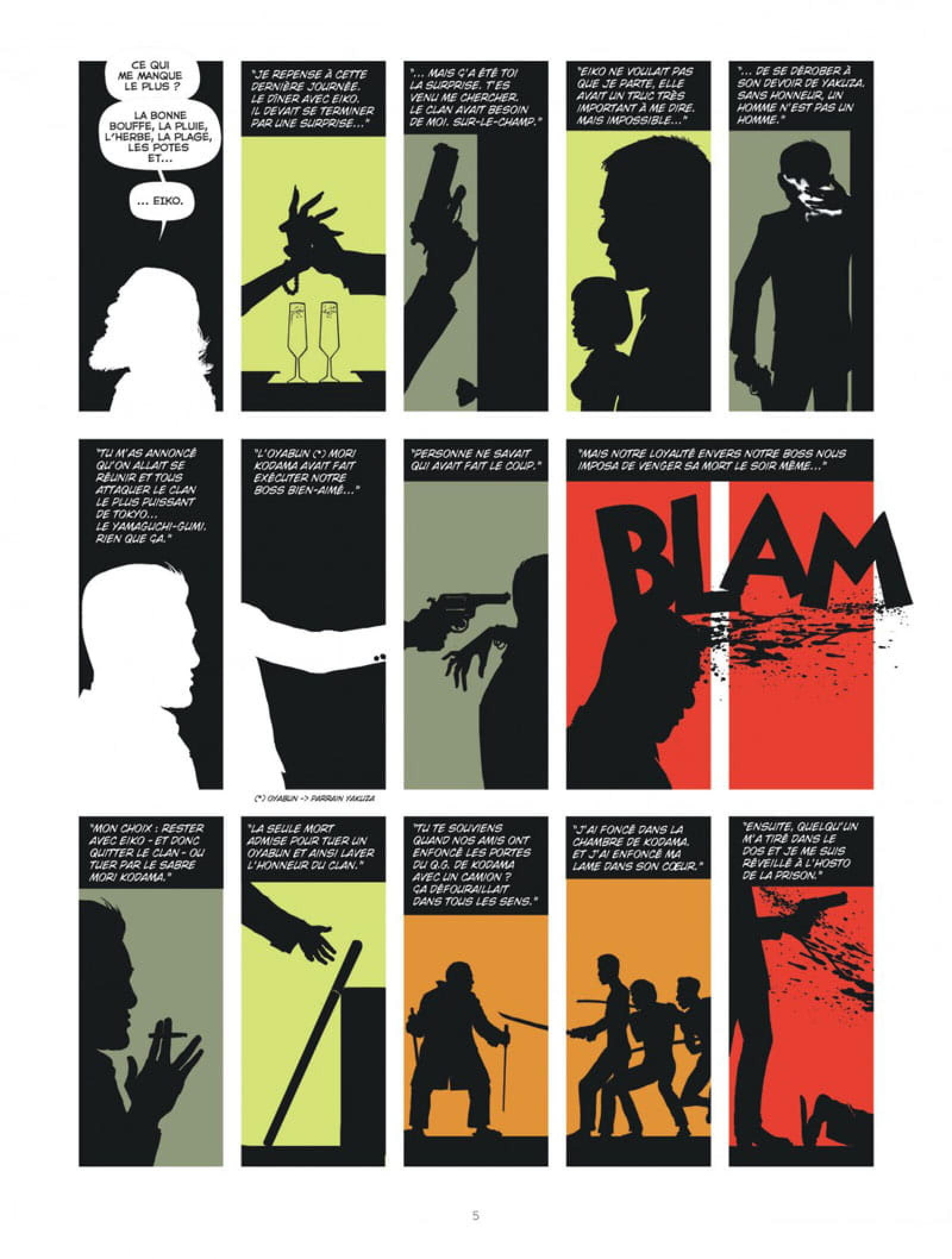 Nettement plus viril, Ameziane dans « Clan » (aux éditions du Lombard) plonge dans les secrets des Yakuza, on s’y trucide, coupe, explose et démembre à tour de pages dans une fresque ambitieuse, hard boiled comme il faut, un poil trop Luc Bessonienne dans les clichés par endroits (prions que ce dernier ne lise pas ça un jour) mais graphiquement puissante à d’autres – il y a ainsi quelques pages en droite lignée du duo Frank Miller / Bill Sienkiewicz sur leur classique « Elektra Assassin » – les connaisseurs apprécieront.