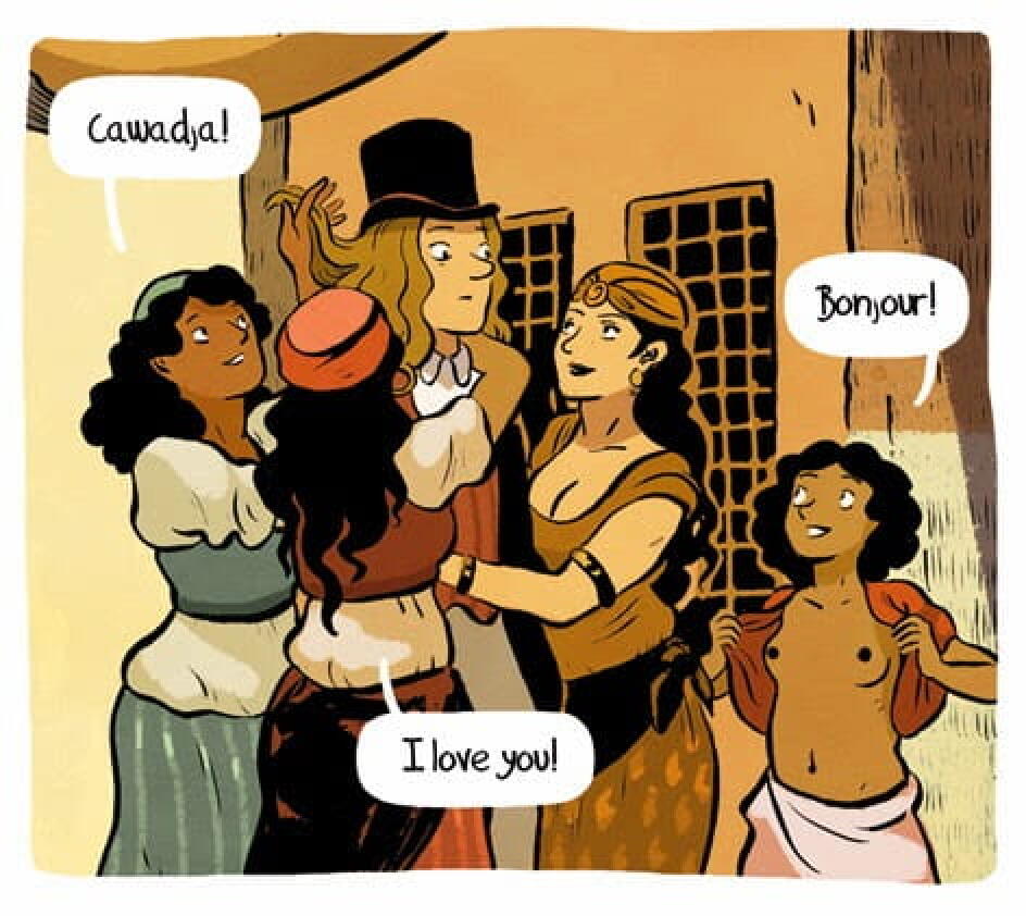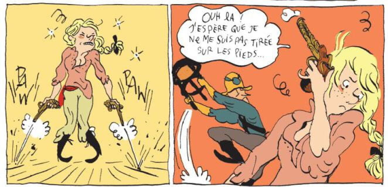 Commençons par une bd de « 7 à 77 ans » – comme on dit en langage Tintin – quoiqu’on y trouvera son lot de prostituées et de tortures diverses. Il s’agit après tout d’un récit de pirates, « De Perles et de Pirates » exactement, mais aussi de cape, d’épées, de grande voile et de frous frous féminins, les héros étant des héroïnes – les cinq filles du célèbre pirate Mortimer Mc Kinley vengeant leur père sur les mers de l’affreux Gouverneur Cortez. C’est une grosse farce aventureuse rondement menée et hilarante, première bd d’un scénariste venu de la télé, Yoan Zaoui, et vivement dessinée – il manque peut-être un peu de détails, mais l’ensemble fait 128 pages hein – par Clotilde Szymanski aka Clotka. Pirates is the new look.