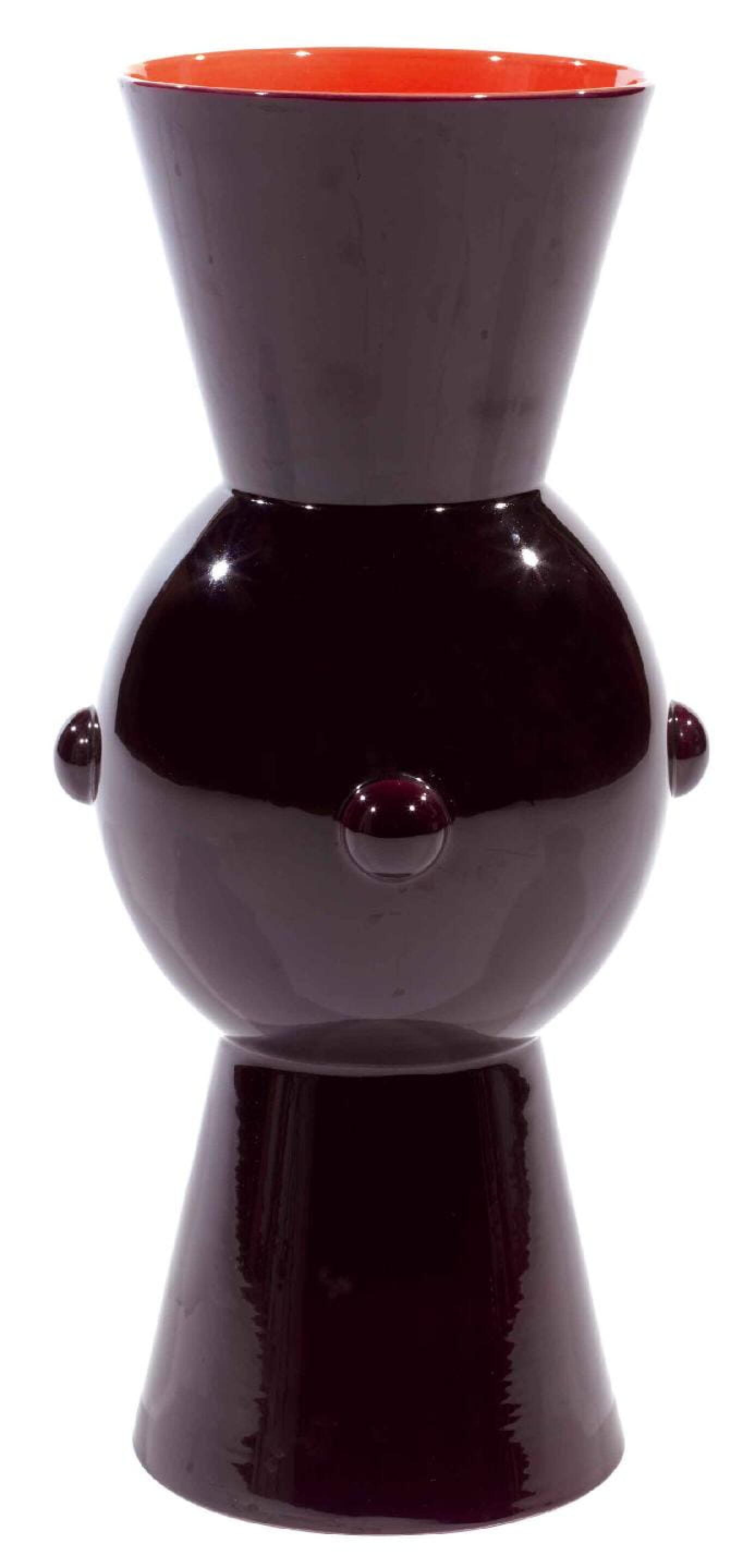 Ses vases faisaient penser à l’Afrique mai aussi aux étrusques , entre amphores et jarres au teintes noires mates, blancs plâtres, allongés comme des Giacometti , ornés de demi-sphères …