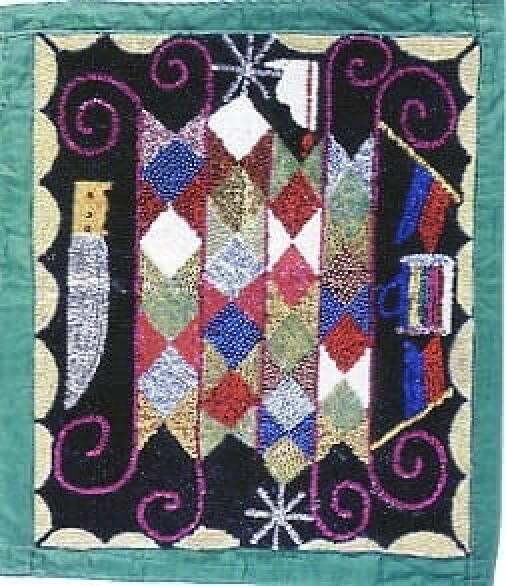 J’ai été frappé par un collier en petites vertèbres, un drapeau vaudou a paillettes, une déesse « diablada » sud américaine – comme une couronne de carnaval avec serpents et grenouilles, un bras en cristal qui écrit les commandements tout en contenant des reliques, de petites balançoires pour divinités, un livre hexagonal qui s’ouvre en étoile, un mini-coran qui tient dans une boite d’alumettes, et des nécessaires pour messes ou mini autel bouddhistes de voyage !!.. Et des masques africains frappeurs descendant jusqu’aux pieds !