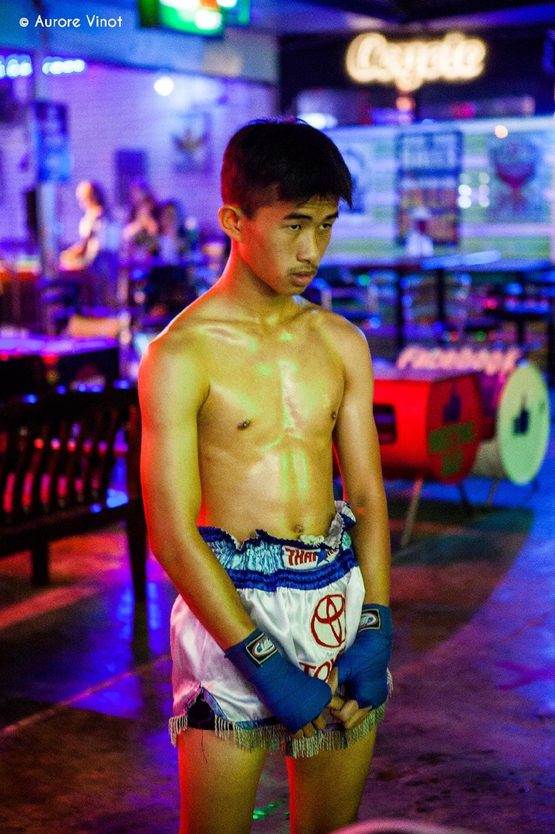 Puis c’est à Chiang Mai, ville du nord de la Thaïlande, qu’Aurore Vinot assiste à des combats. Les paris fusent, les familles encouragent leur progéniture, la nuit est tombée et le rituel peut commencer. Les jeunes boxeurs ont cinq rounds de trois minutes chacun. L’exposition nous dévoile quelques portraits d’avant les combats, avec cette ambiance nocturne, le reflet des néons sur les corps luisants des jeunes combattants, ainsi que leur regard concentré sur la victoire.
