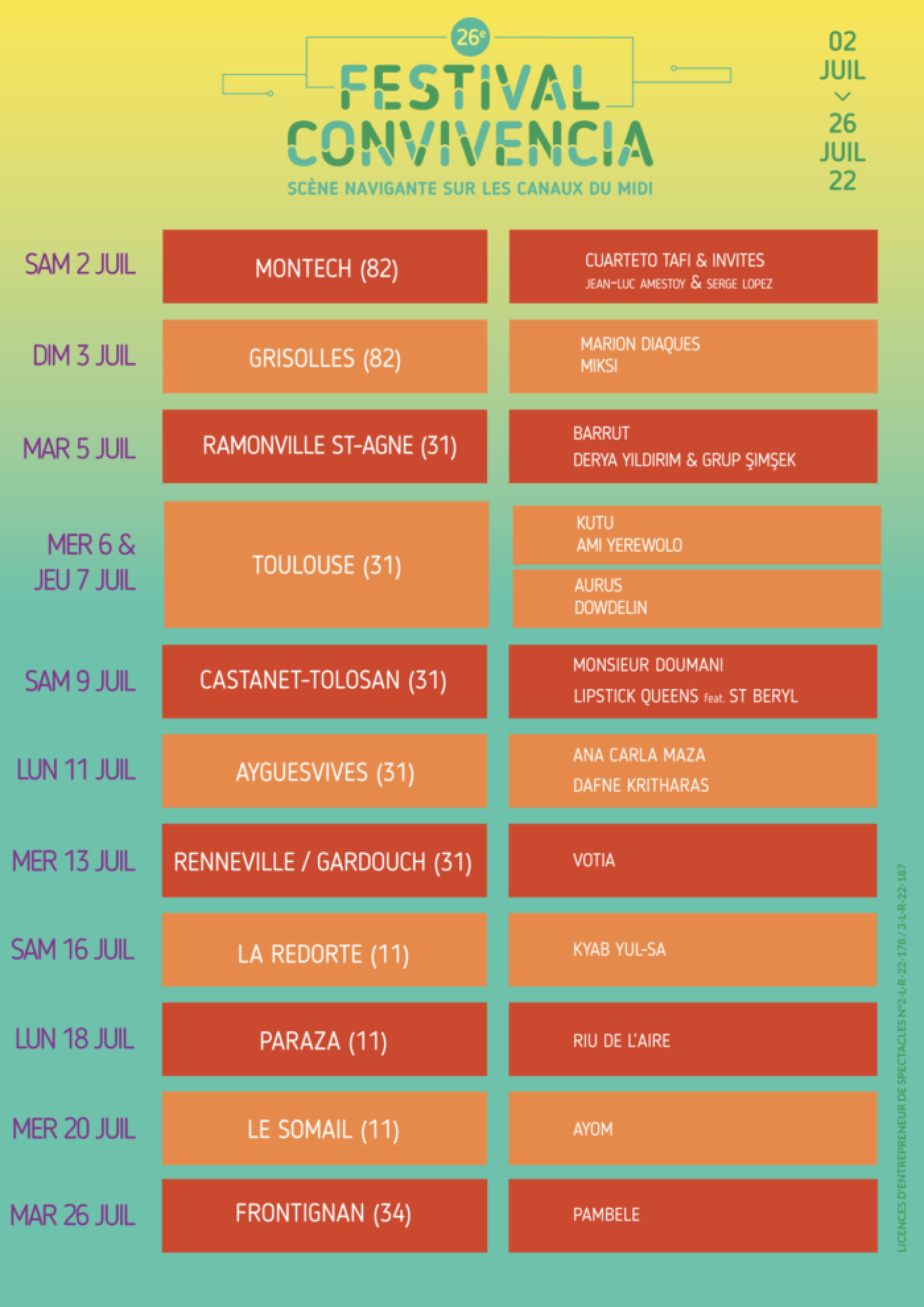 Le festival Convivencia est là et propose de vous embarquer à bord de la péniche la Tourmente et sur le canal du Midi du 2 au 26 juillet 2022. Un festival itinérant, vous l’aurez compris qui, entre chaque étape, vous fait voyager pour de vrai, avec de la musique et des artistes venus du monde entier. Mais pas seulement puisque le festival organise aussi des ateliers et rencontres artistiques entre chaque escale, des balades ou encore des performances, expositions et vernissages sur la péniche.