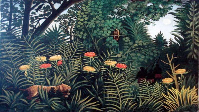 “A l’affiche” nous avons le Douanier Rousseau, qui est nul autre qu’Henri Rousseau, (1844-1910), peintre français surnommé ainsi car il travaillait dans un « Octroi ». Autodidacte, il a dû attendre la cinquantaine pour commencer à être apprécié. N’ayant jamais quitté la France, il est principalement connu pour ses « jungles » telles que celle-ci !