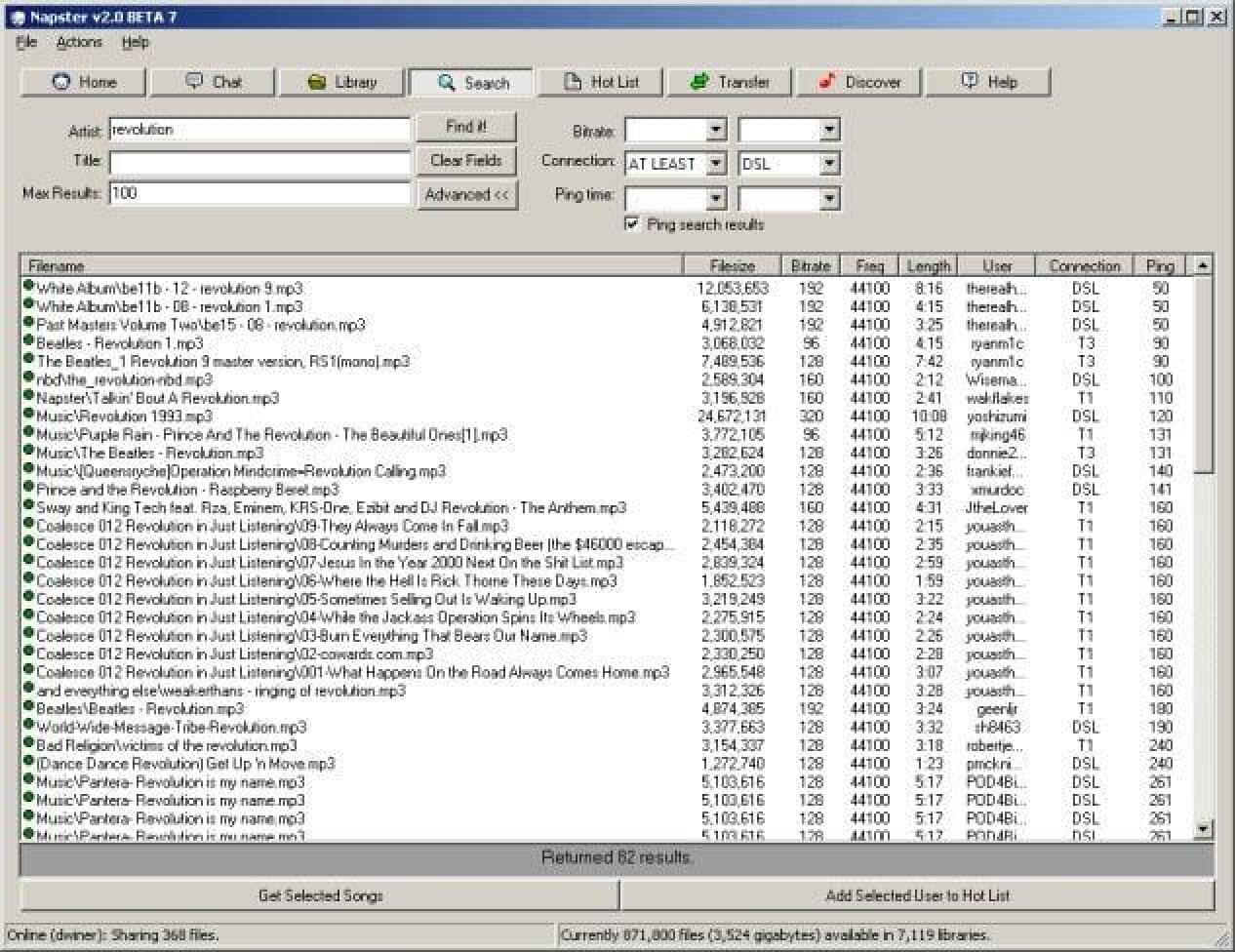 Dès 1999, Napster, pionnier du partage de fichiers en peer to peer (« de pair à pair ») est le premier à profiter véritablement de la brèche, et à faire de la prolifération du format mp3 un allié de choix. Le service perdra rapidement (en juillet 2001, le service est fermé) la bataille menée conte l’industrie, mais confortera l’idée qu’une guerre est possible : d’autres (KaZaa, emule) prendront la relève, banalisant une idée dangereuse pour les artistes et pour ceux qui les entourent, mais bénéfique pour les utilisateurs, souvent peu conscients de la révolution qui est sur le point de se produire : la musique est belle et bien devenue hyper accessible, et totalement gratuite. Pourquoi continuer, alors, à la payer ?