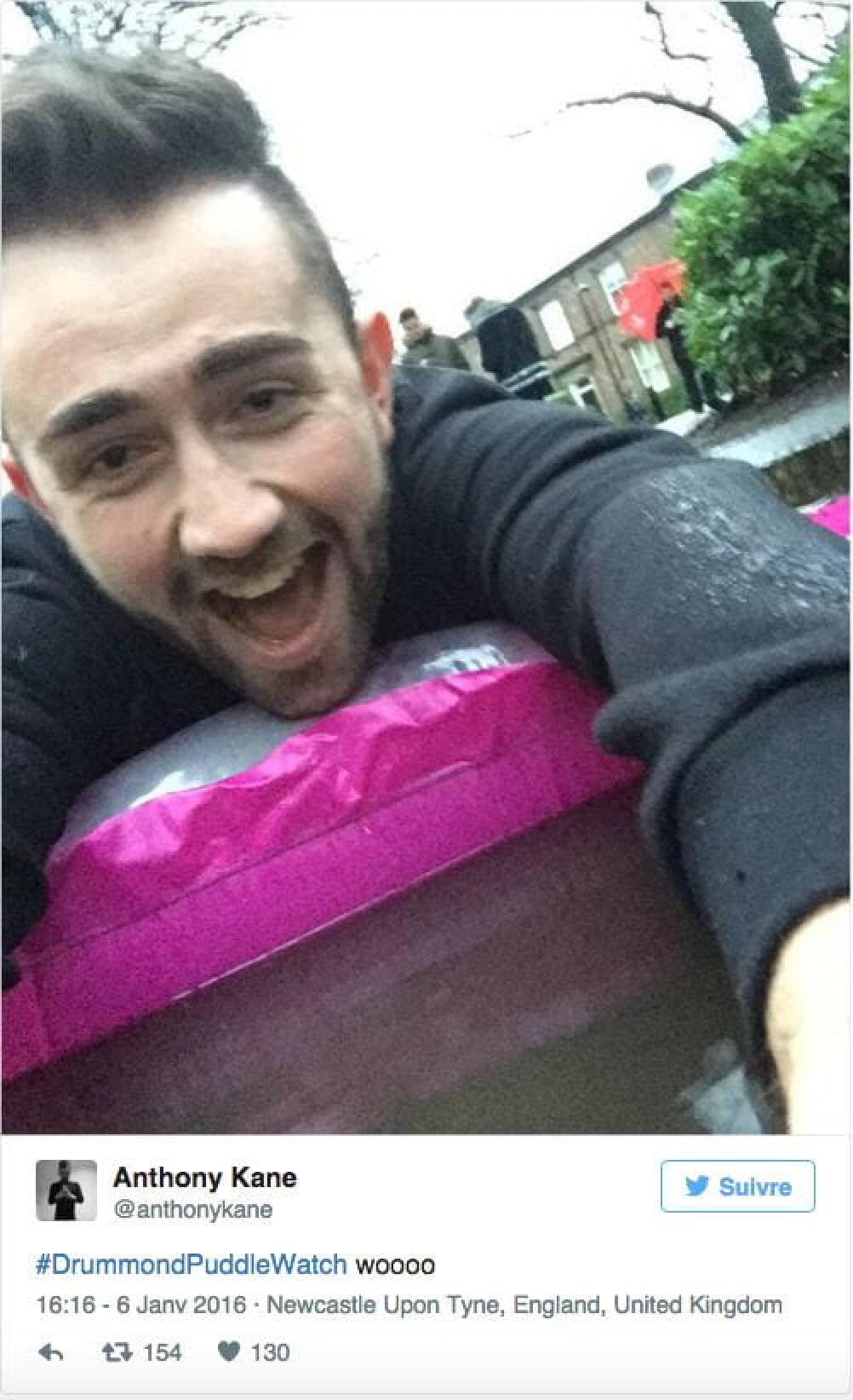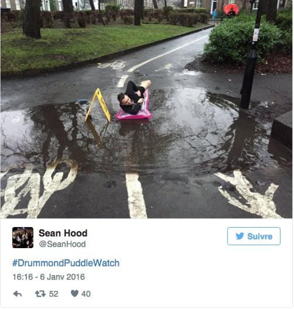 Alors, comment vous expliquer ? C’est l’histoire d’une flaque qui s’est formée dans la rue à Newcastle en Angleterre. Le problème avec cette flaque c’est qu’elle est assez grande et rend par conséquent sa traversée un peu difficile. Du coup, un internaute décide de filmer la scène et de la diffuser en périscope. Un hashtag est lancé, #Puddlewatch et #DrummondPuddleWatch et boum c’est le début de la folie, il devient trending topic en Angleterre. Résultat, 20 000 personnes en moyenne regardent cette flaque en permanence et en direct depuis ce matin.